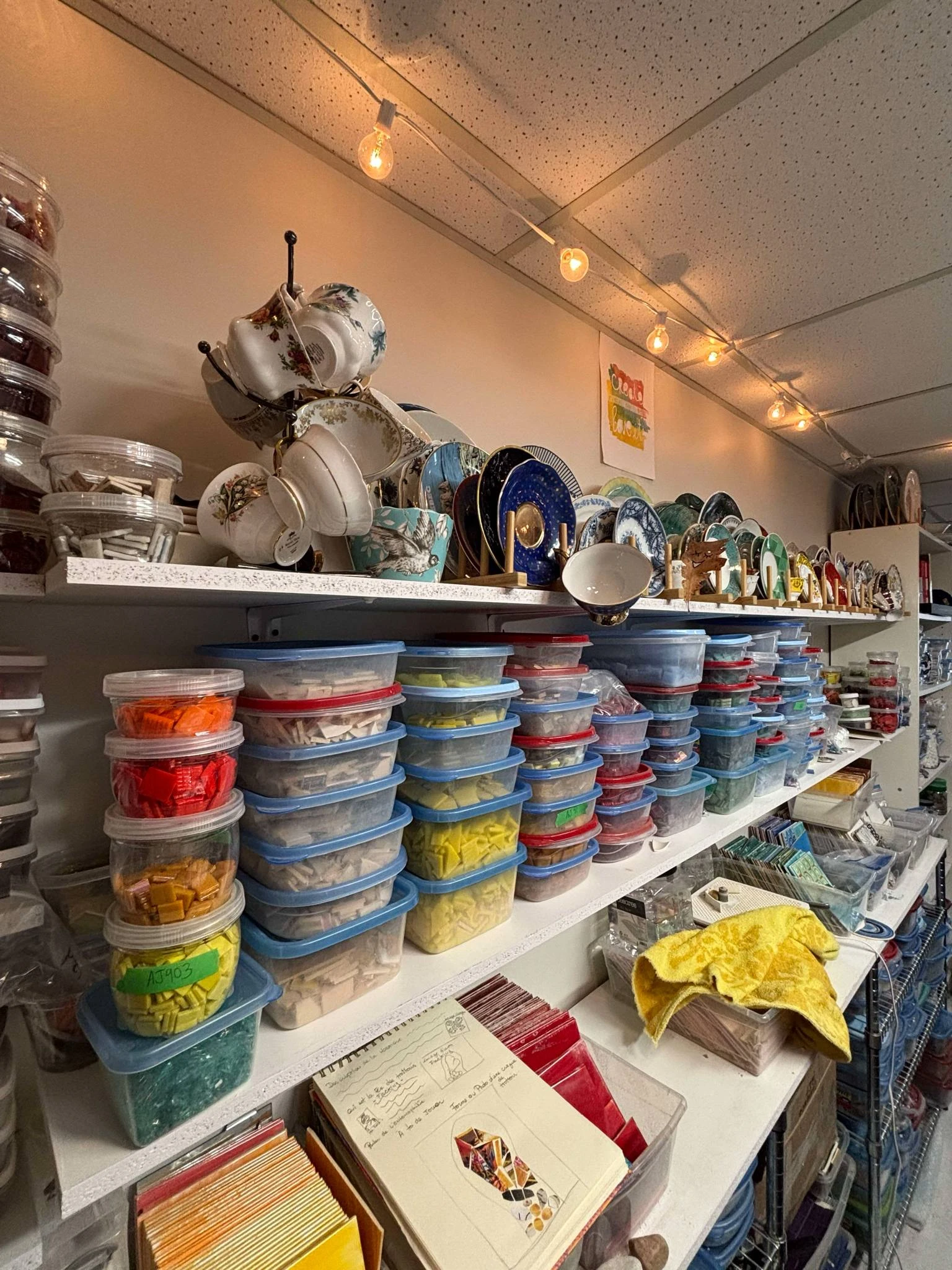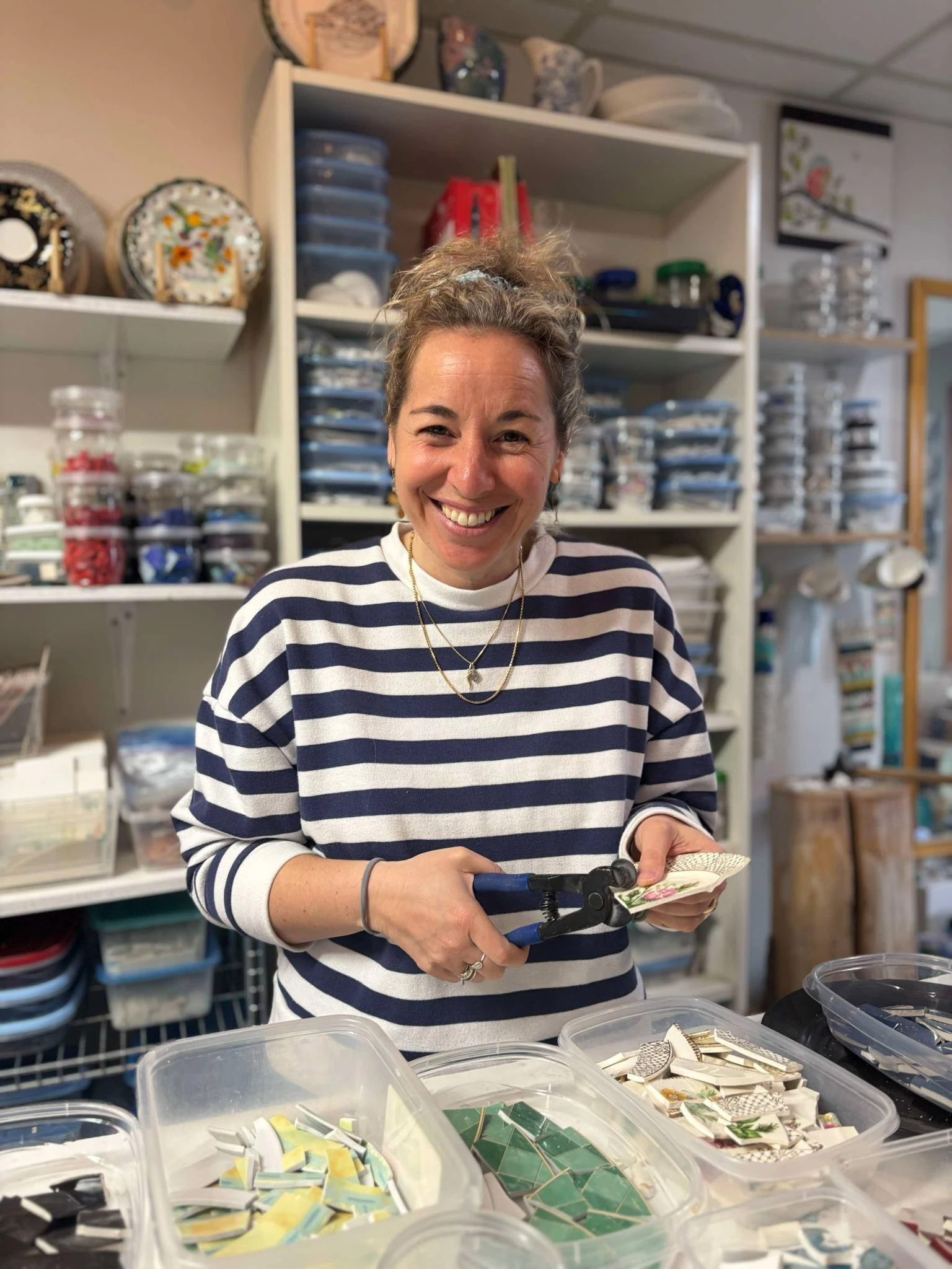 Les morceaux de mosaïques sont dispersés sur une grande table de travail, puis classés dans des bacs sur des étagères qui s’étendent jusqu’au plafond. « Ce sont des morceaux de vaisselle récupérés ou que j’achète dans des bazars. Ils sont résistants et lustrés des deux bords », décrit celle qui n’hésite pas à venir travailler en pyjama si une idée germe spontanément, le soir.