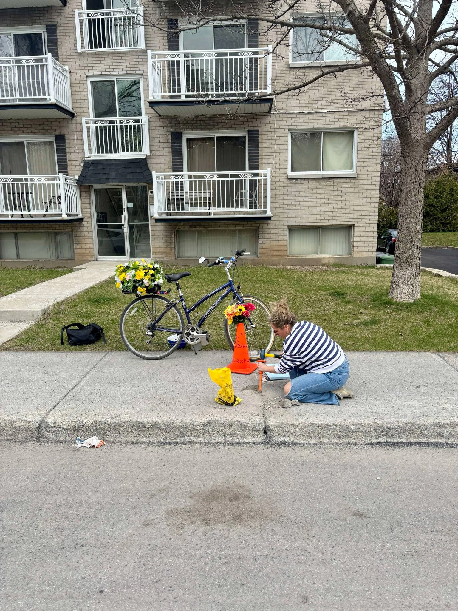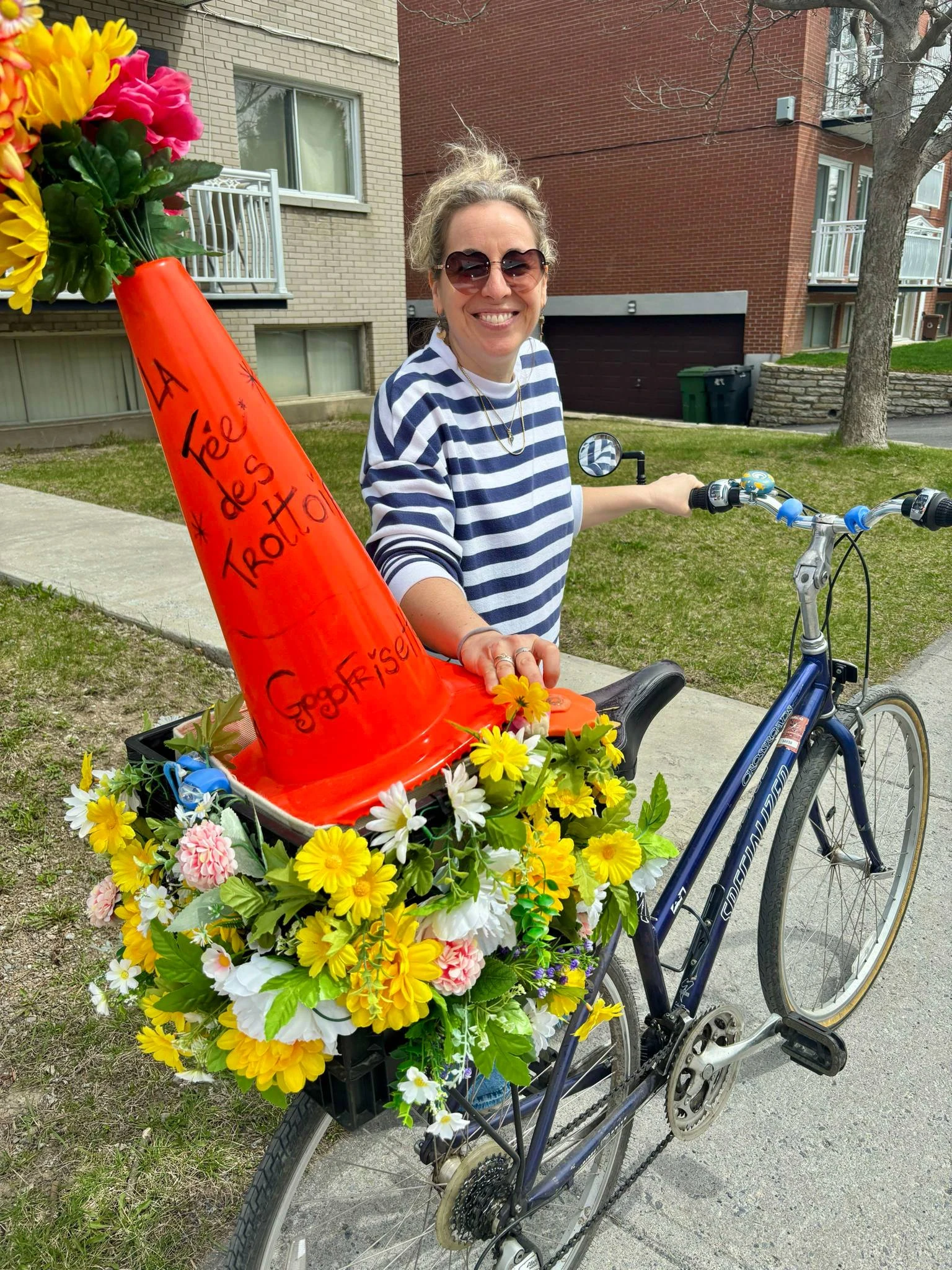 En ces heures où les nouvelles se font moroses, ça fait du bien de talonner la Fée des trottoirs tandis qu’elle pousse son vélo rempli de matériaux vers le lieu où échouera sa dernière mosaïque. Une gerbe de fleurs dépasse aussi du cône orange qu’elle dépose sur son œuvre, le temps que le ciment prenne.