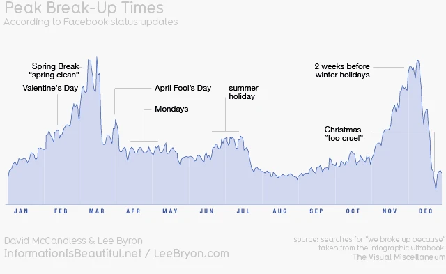 Voilà des mots que je ne prononce plus depuis quelque temps. Et je ne suis pas le seul. Au moment d’écrire ce texte, plusieurs personnes, comme moi, traversent une séparation, et ce, parce que les couples ont tendance à se quitter massivement entre la Saint-Valentin et le poisson d’avril. C’est en tout cas ce qui ressort des données de Facebook analysées dans le livre The Visual Miscellaneum et dont tu peux consulter le graphique ici.