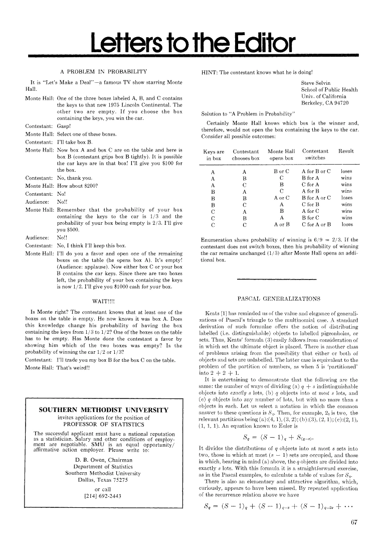 En effet, le professeur de biostatistique Steve Selvin avait résolu le problème dans une lettre ouverte publiée dans le American Statistician en 1975 :