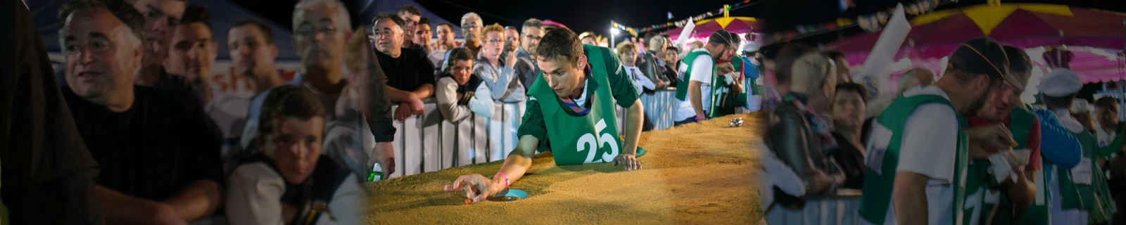 La course bat son plein autour du circuit, une boucle de sable de 70 mètres posée à hauteur d’homme et truffée d’obstacles. L’annonceur, short et débardeur blanc, commente chaque action des 45 équipes de 3 joueurs présentes au départ. Et comme aux 24h du Mans, la célèbre course d’endurance de voiture, chaque participant appelé pour l’occasion “pilote”, doit jouer au moins 7 heures. Ainsi, les pilotes tapent chacun leur tour dans une bille en terre cuite, le même modèle pour tous, et marquent leur position avec un modèle réduit de bagnole. Pour le reste, le principe est celui d’une compétition classique. Il s’agit de faire parcourir à sa bille plus de chemin que les autres.