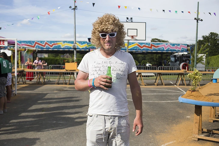 La bille n’est pas une discipline évidente, comme le montre l’écart technique important entre les participants. Dans la 3e manche, une pente de bois hyper raide bloque le peloton alors que les leaders s’envolent vers la victoire. Les joueurs s’énervent et charrient ceux qui sont en tête. “Les mecs devant ils ne sont pas drôles, parce qu’en fait moins tu bois, plus tu gagnes”, râle Antoine, 20 ans, déguisement de pompier et grosse lance à incendie cousue sur la braguette…