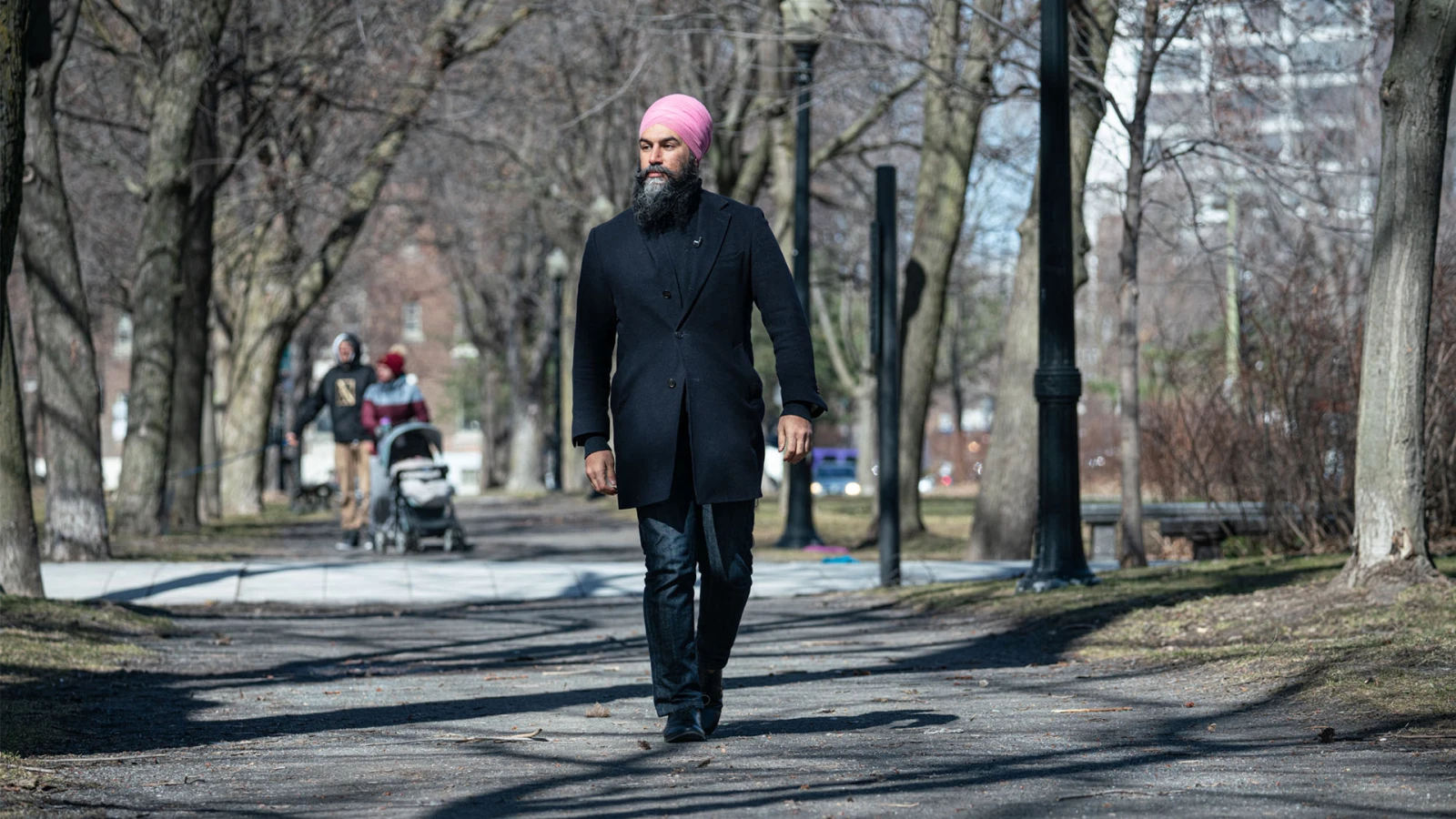 Jagmeet Singh préfère rester debout et se met soudainement à sautiller sur place. « Je suis frileux », justifie cette carte de mode assumée, vêtu d’un élégant manteau noir ajusté et coiffé de son dastar rose pétant. Selon sa page Wikipédia (une source fiable), il porte des costumes sur-mesure, qu’il créé lui-même.