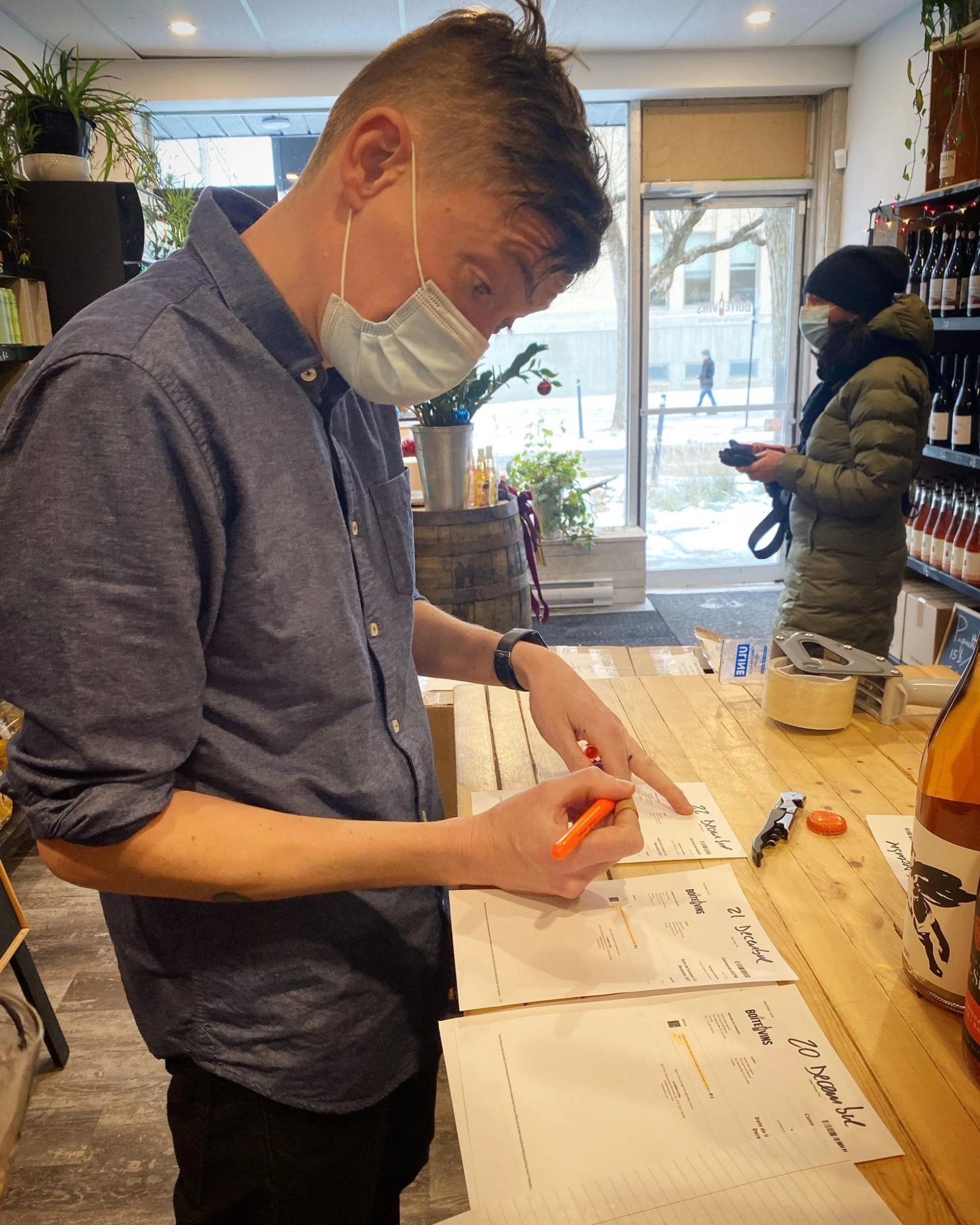 Même si le téléphone ne dérougit pas et qu’ils sont dans les commandes par-dessus la tête, les deux jeunes hommes ont un gros sourire estampé au visage. « On se fait dévaliser chaque jour, mais on ne se plaint pas. Le message qu’on veut envoyer, c’est que les épiceries fines et des endroits comme ici sont de bonnes alternatives à la SAQ », explique Louis-Philippe, qui enfile les entrevues dans les médias depuis quelques jours, ce qui a un impact direct sur ses ventes.