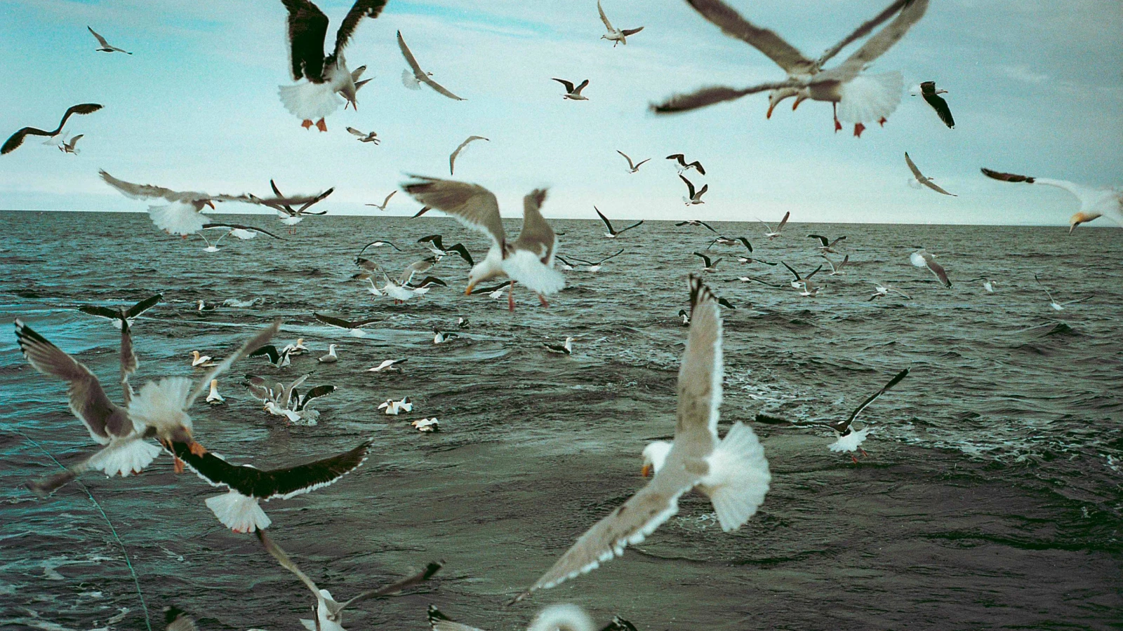 Une fois le cachot levé, j’escalade la structure et retire de ses entrailles les anciennes poches de poissons pour les remplacer par des fraîches. Je jette ensuite par-dessus bord les restants grignotés qui génèrent des querelles dignes de famine dans la colonie d’oiseaux marins qui nous suit telle une remorque ailée. « Mangez, les rats », crie Junior alors que je contemple le plongeon kamikaze des fous de Bassan.