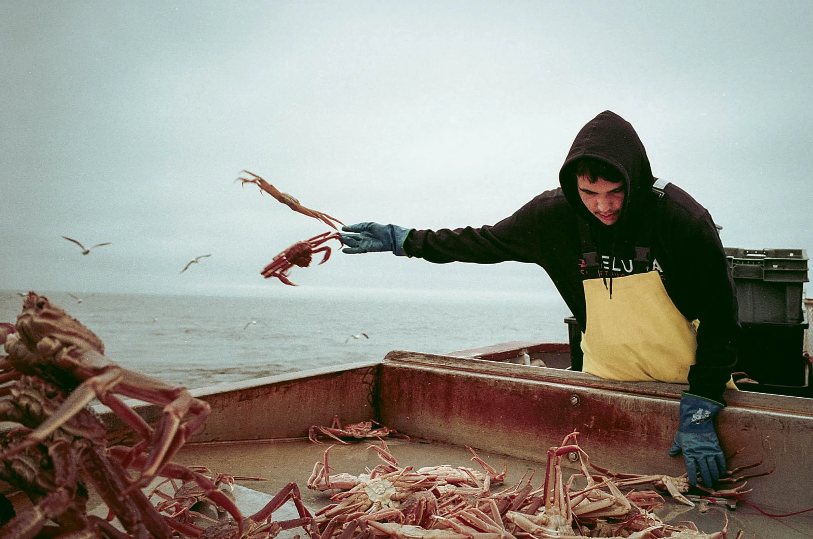 Des rafales de crabes s’effondrent encore et encore sur la table de tri. Vite, de la nouvelle bouette. Nourrir les rats. Éviter leurs fientes. Lancer les petits crabes. Remplir les pans. Maintenir le rythme, une bouée à chaque 1/5 de mille.