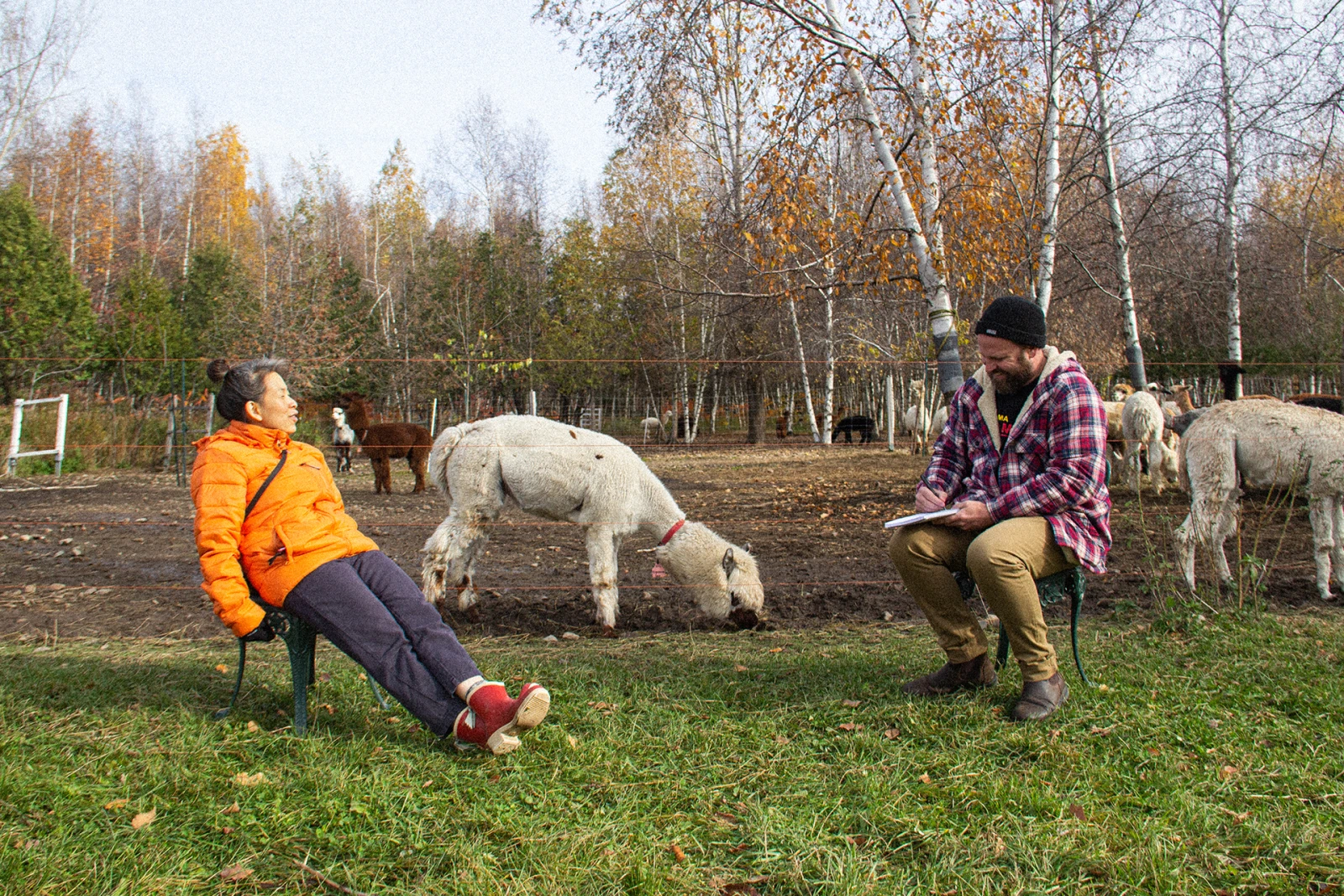 On s’installe enfin sur deux chaises devant l’enclos. C’est bien beau les alpagas, mais faut bien parler d’Em un peu aussi. « Tu me sors plus de ma zone de confort ici que dans un peep show », me lance Kim au sujet des alpagas.