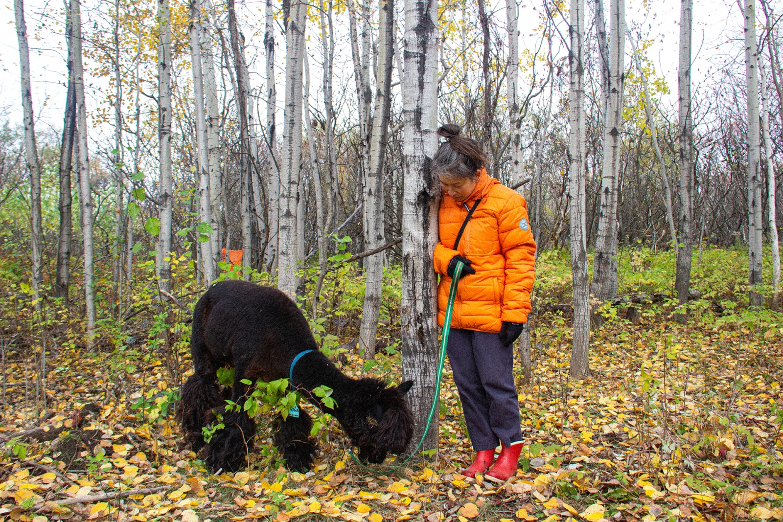 Je perçois soudain le trouble dans le visage de Kim. Il faut parfois un peu tirer sur la laisse pour faire avancer l’alpaga et ça, elle n’aime pas ça. Moi non plus d’ailleurs. « Moi je le laisse me tirer, je suis une mauvaise mère! », lance l’autrice en éclatant de rire pendant que Patriote, rebelle, l’entraîne dans le sous-bois.