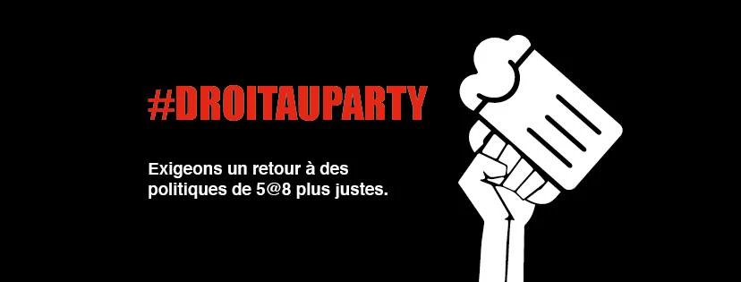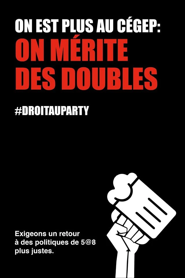 Charles Dubé, étudiant de communication-marketing, lance une campagne contre les nouvelles contraintes. Sous la ligne directrice « Droit au party », ses slogans reprochent les nouvelles politiques : « Make Thursday Nights Great Again », « On est plus au cégep, on mérite des doubles », « Rectorat partout, justice nulle part ». Les visuels ont été partagés sur les réseaux sociaux des multiples facultés.