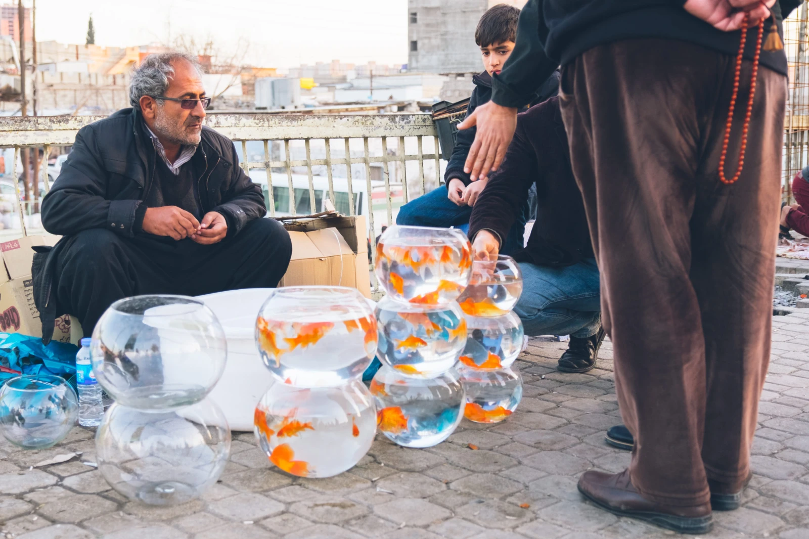 Vendeur de poissons rouges en Irak. C’était très étrange d’assister à une scène comme celle-ci alors que la guerre contre l’État islamique battait son plein à seulement 80 kilomètres de là.