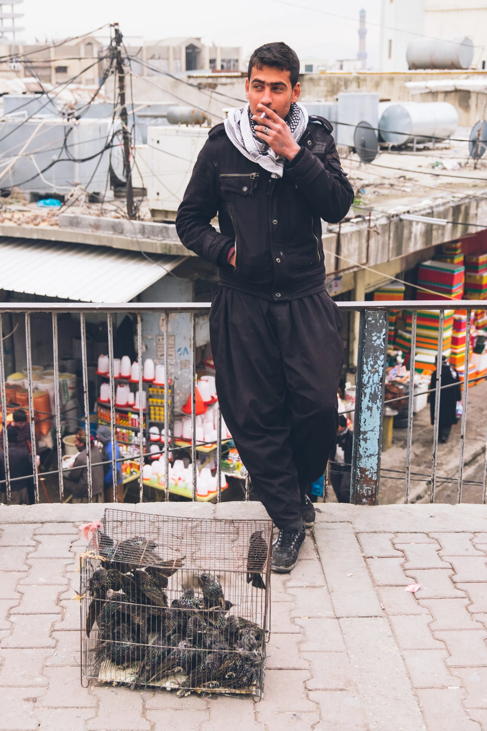 Piégeur d’oiseau en Irak. Pour l’équivalent de 1 $, les passants ont le choix de libérer l’animal ou de le consommer. La grande majorité des gens décident de libérer l’oiseau, voyant le geste comme un acte de compassion qui amènera la prospérité dans l’avenir.