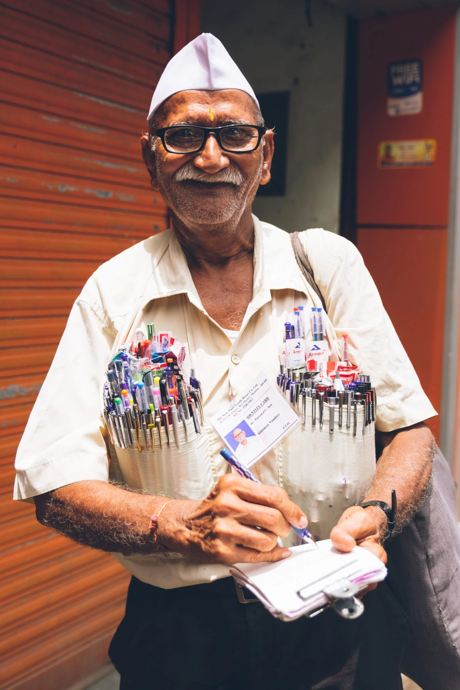 Vendeur de crayons en Inde. En plus d’un vaste choix de stylos et pousse-mines, le vendeur transporte un calepin pour que les client.e.s puissent essayer la marchandise.