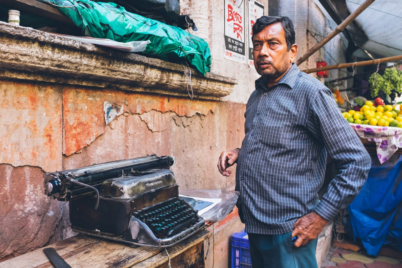 Dactylographe en Inde. Les travailleurs s’installent aux alentours des bâtiments gouvernementaux et aident les citoyens à rédiger leurs papiers officiels.