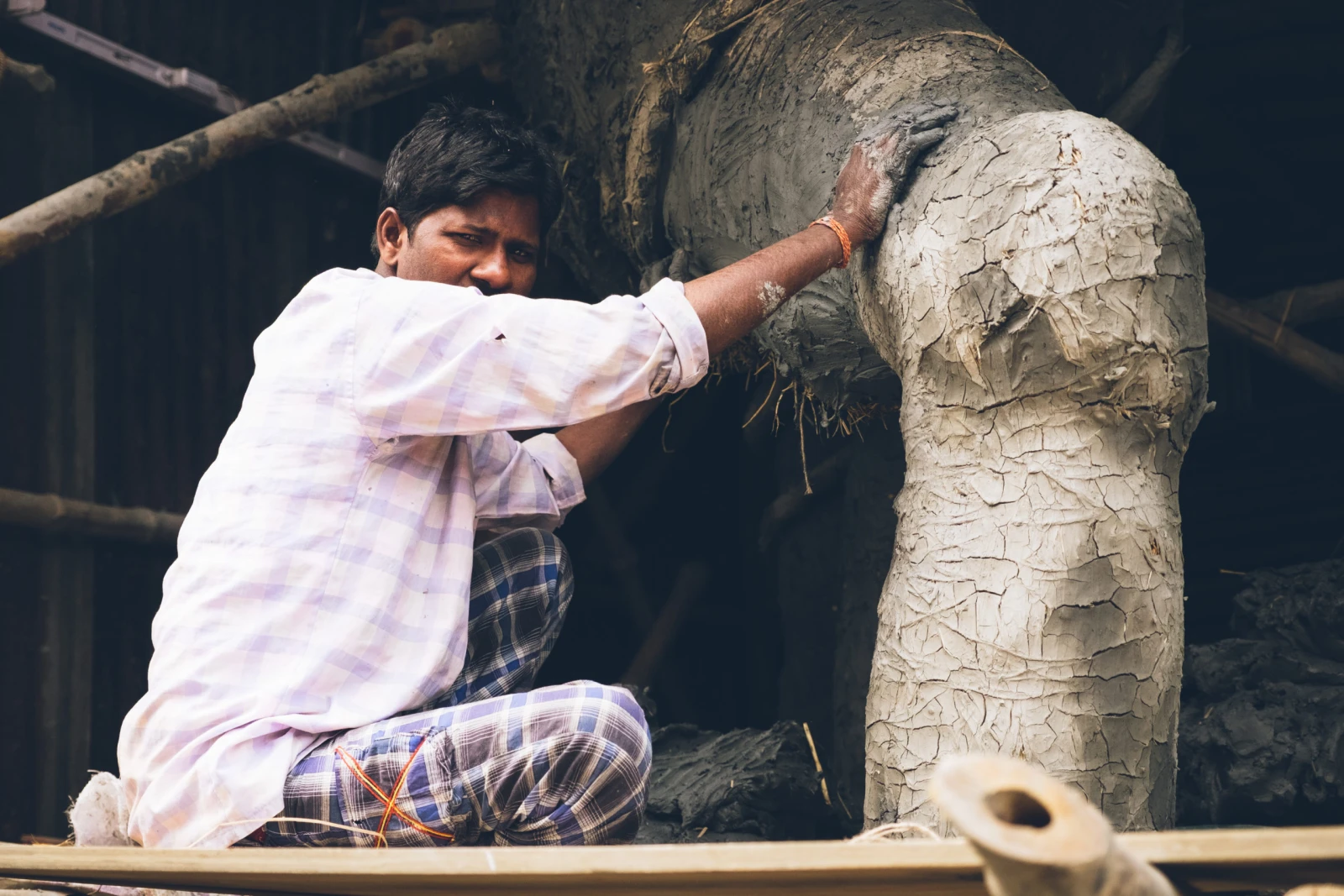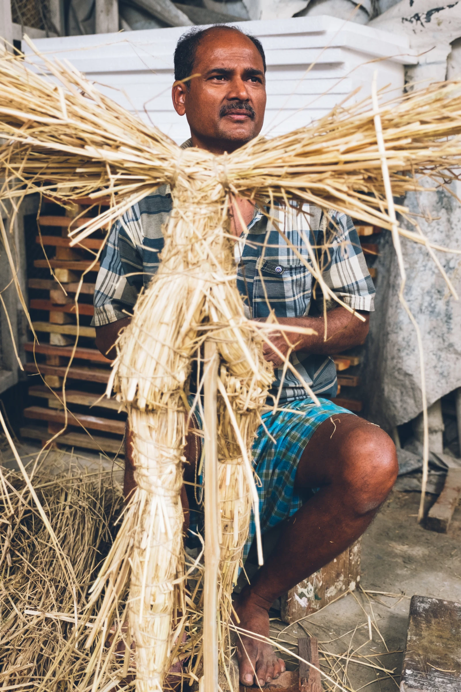Empailleur en Inde. Cet empailleur monte une structure à base de foin et la relaie ensuite au sculpteur qui la complète avec de l’argile.