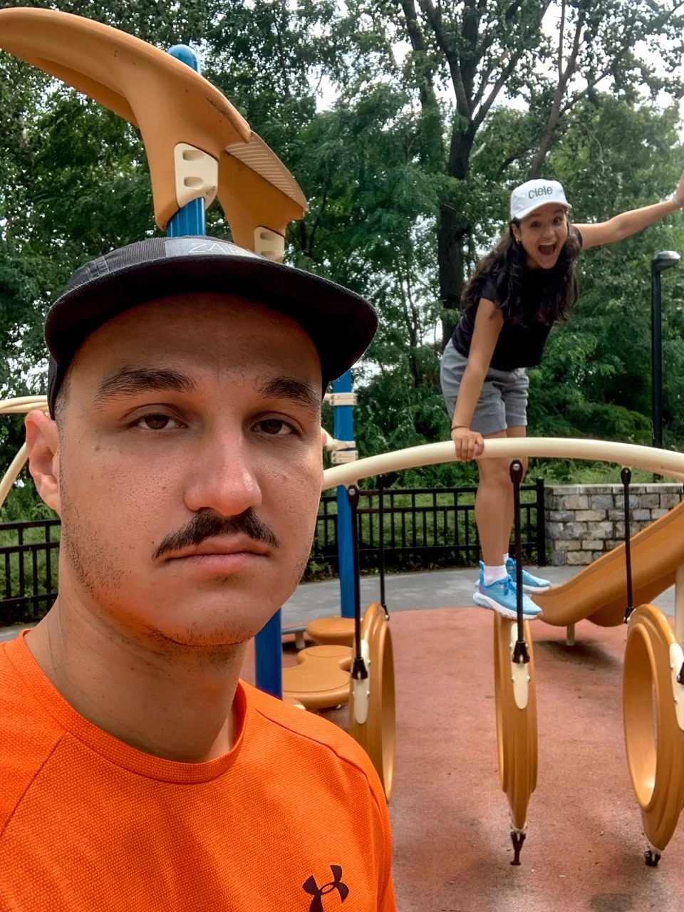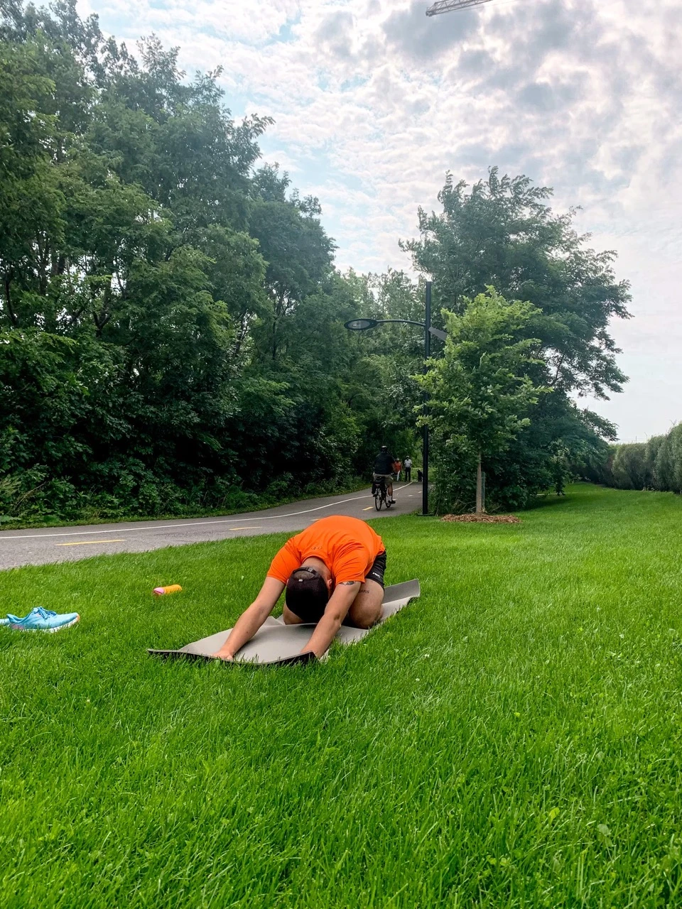 Il est vrai qu’on avait donné, côté effort physique en une seule journée. Ma sœur étant une adepte de yoga chaud, je me suis dit qu’il était temps qu’elle fasse sa part en me proposant quelques positions qui nous permettraient de nous étirer (en plus, j’avais déjà chaud, ça marche). Après l’avoir suppliée de descendre des modules pour enfants (voir photo ci-dessous), on a pu se trouver un petit coin tranquille au parc de l’esplanade de la Pointe-Nord.