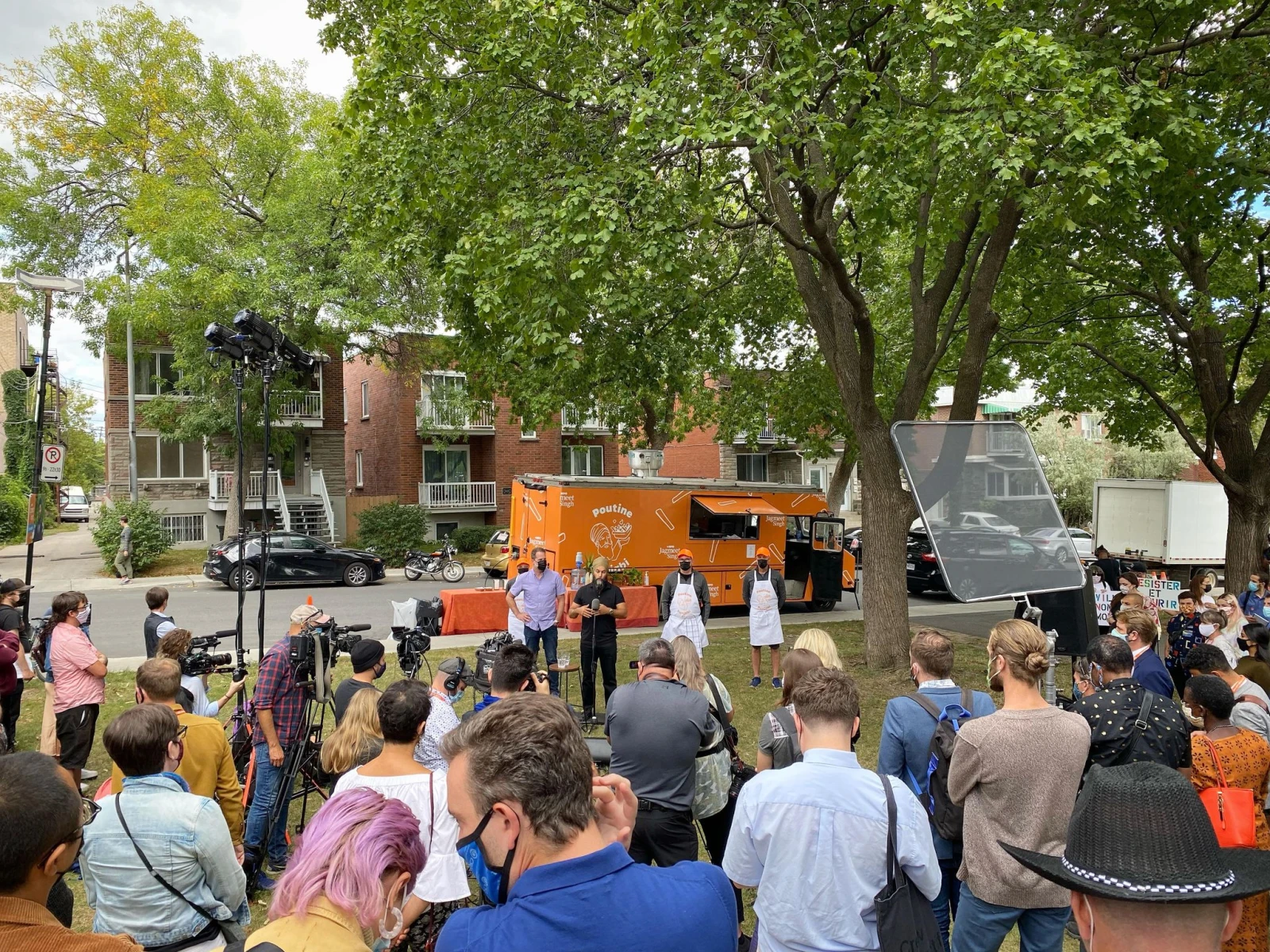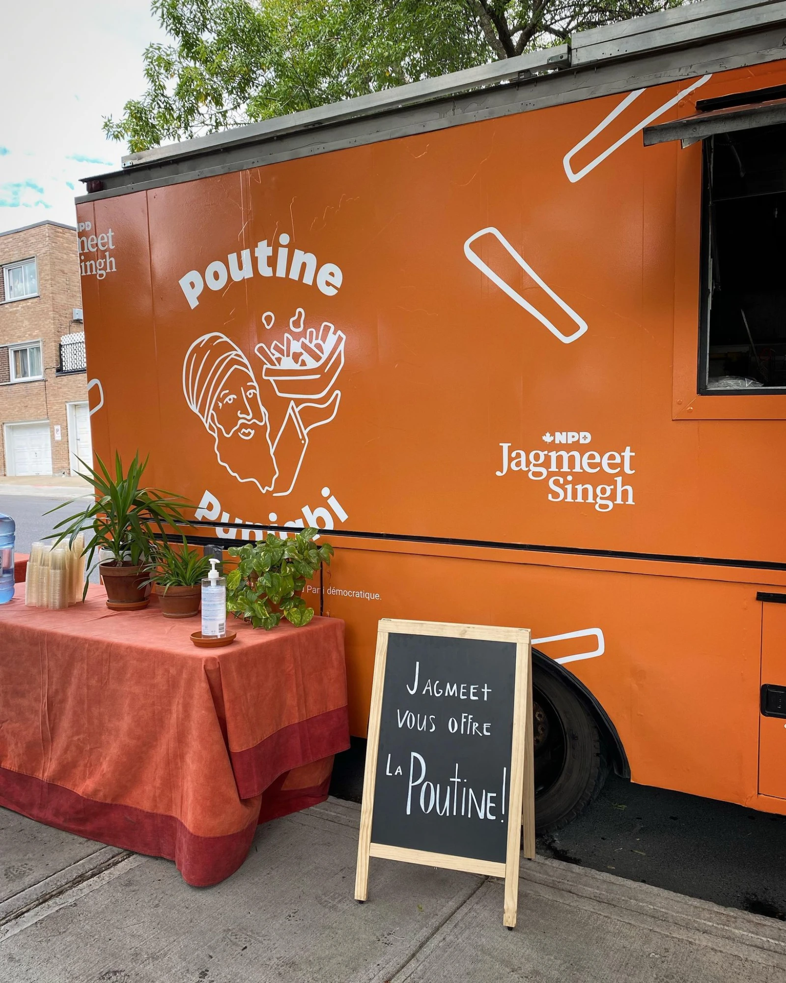 Sur place, le food truck orange arbore le visage du chef néo-démocrate et les ingrédients de sa poutine sont placardés sur la carrosserie.