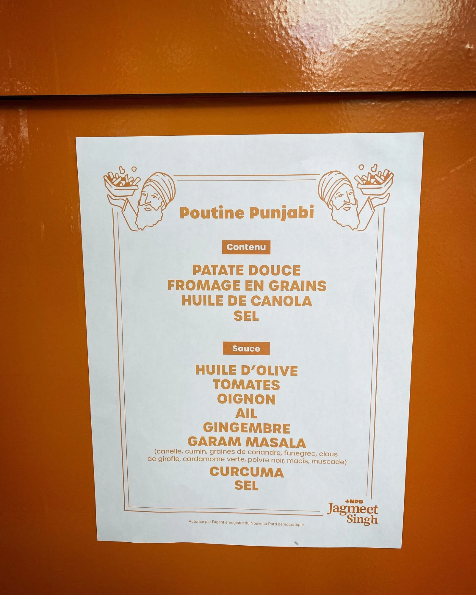 J’ai tellement faim que je suis prêt à échanger une poutine contre mon vote. Jagmeet me tend sa spécialité de couleur orange.