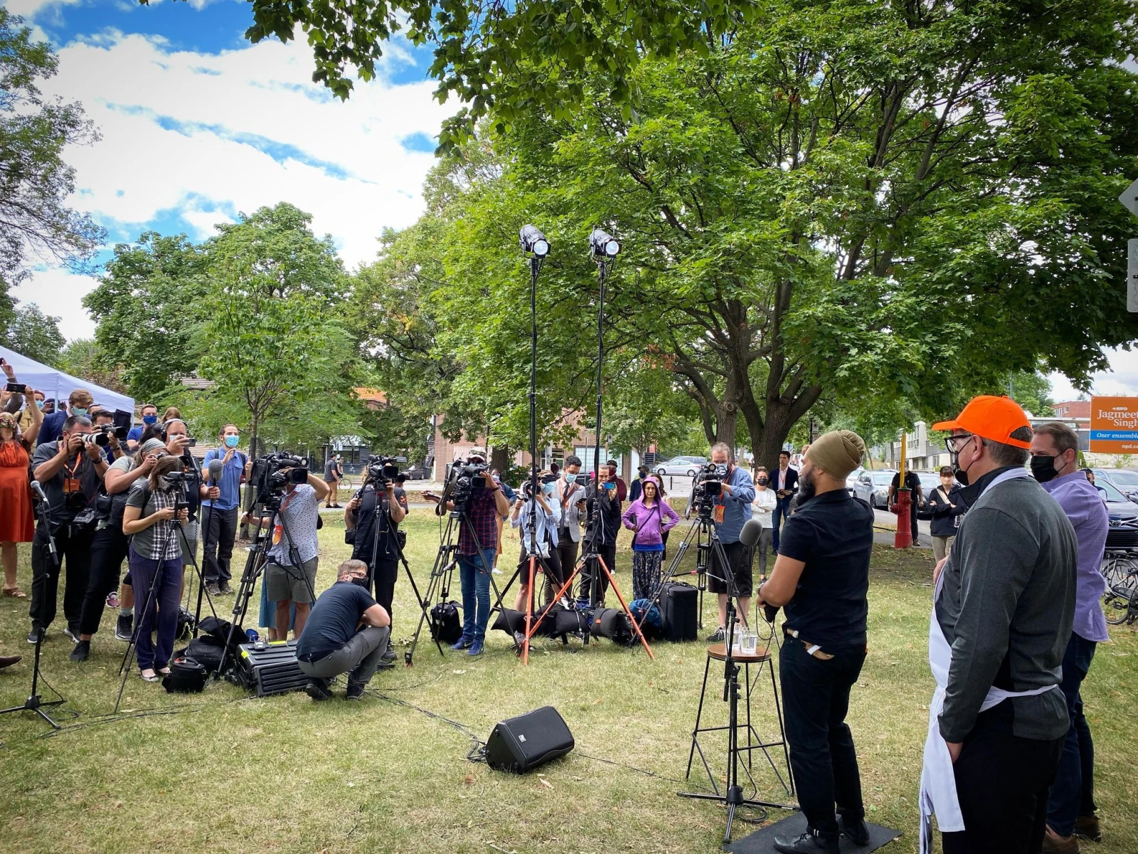 Plusieurs militants, sympathisants, badauds, candidat.e.s et journalistes attendent Jagmeet Singh.