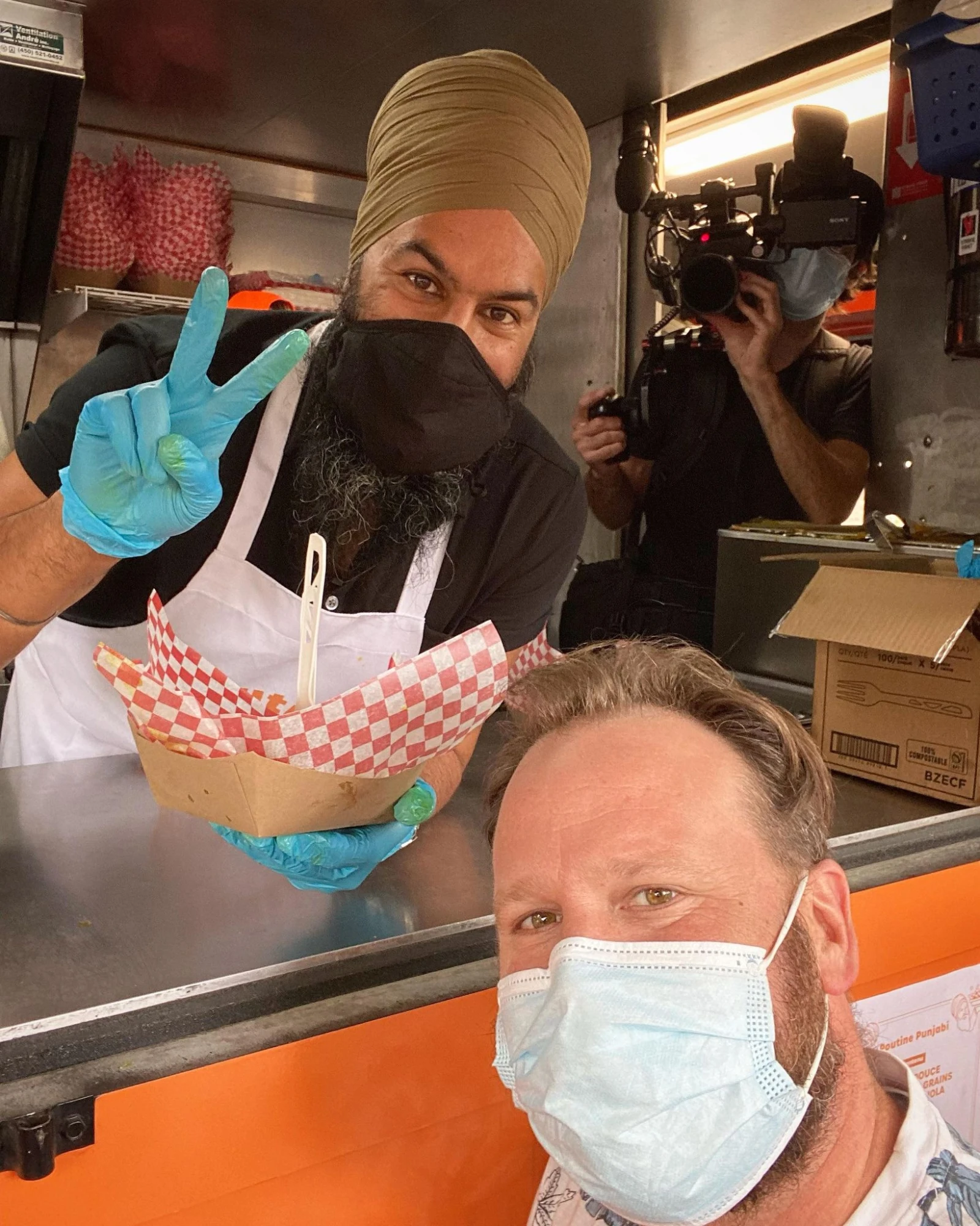 Jagmeet Singh y rencontrait ses troupes, en plus de leur servir sa, apparemment, délicieuse poutine punjabi à bord d’un food truck personnalisé. « Tu auras environ quinze minutes tout seul avec lui à ce moment! », m’avait vendu son attachée de presse Nina.