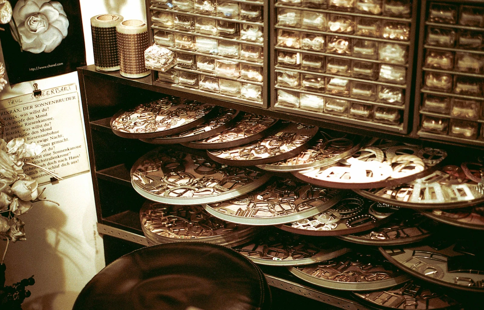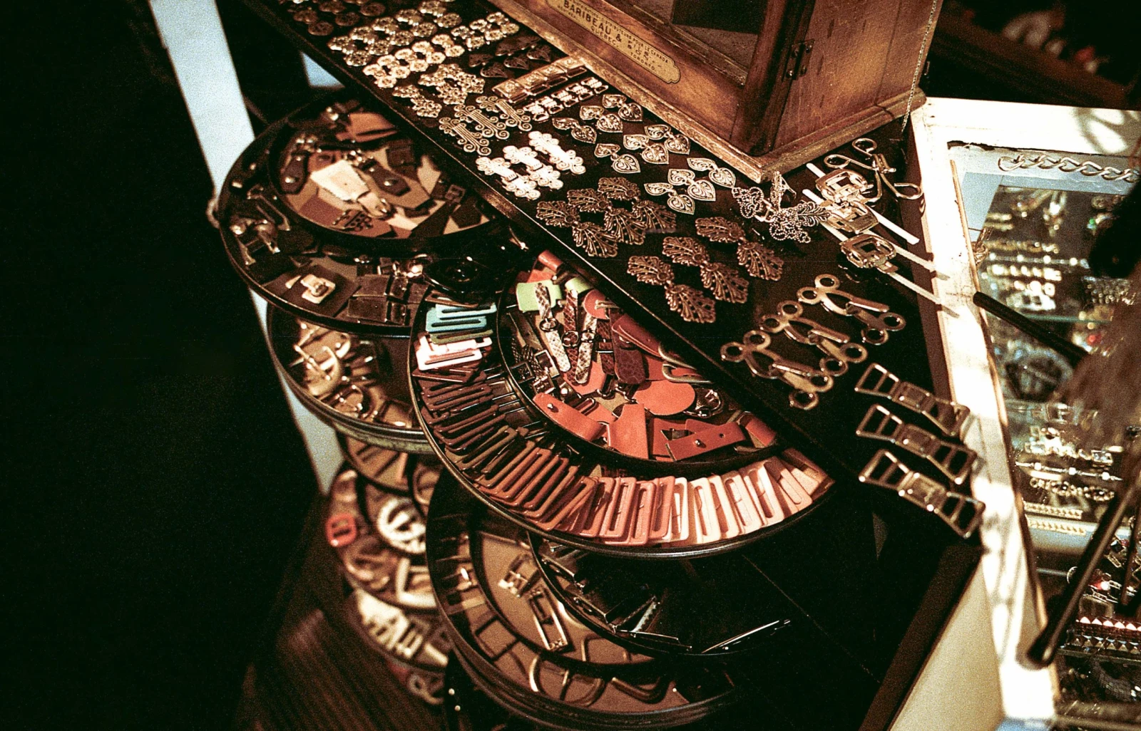 À travers les continents de textures bigarrées, notre regard navigue, émerveillé par l’abondance qui s’offre à lui. Une accumulation que l’on devine fruit de plusieurs décennies. « J’ai acheté à des grossistes, ramassé les lots de boutiques qui fermaient, dépanné des collectionneurs qui voulaient se débarrasser de leurs montagnes de boutons, précise-t-elle. J’ai des contacts en Italie, en France, en Angleterre. C’est incroyable, la variété qui s’est produite. »