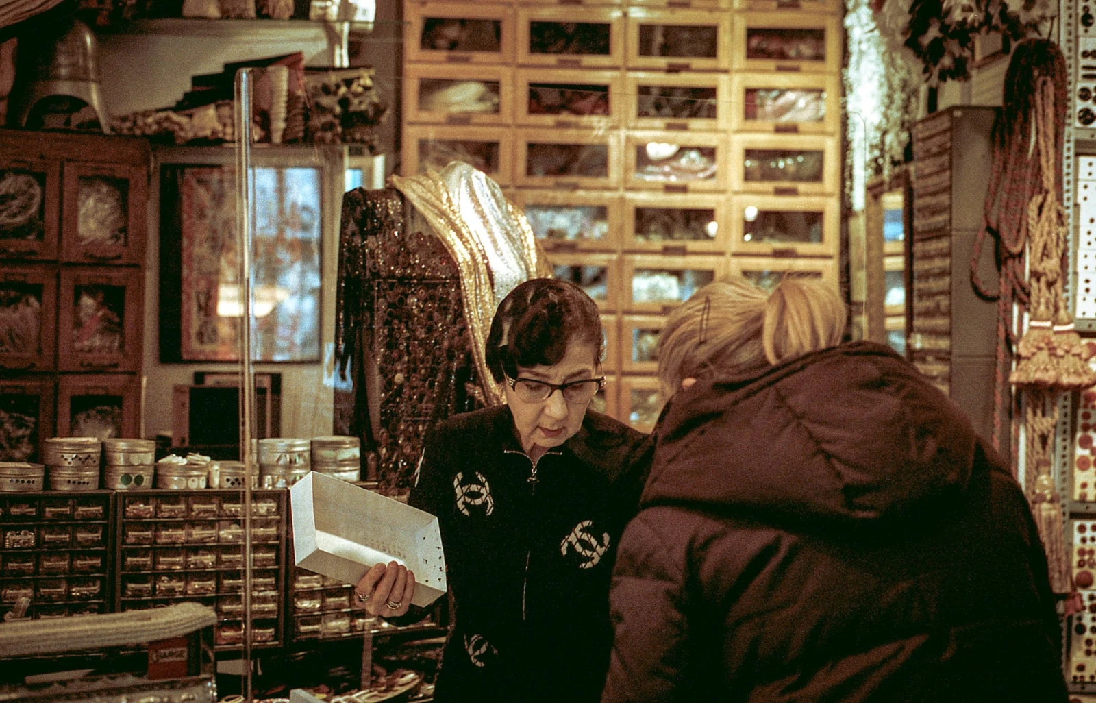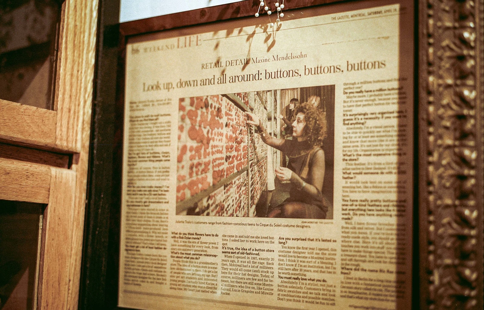 Quelques clientes explorent avec nonchalance les rivages infinis de boutons, effleurant leurs surfaces du bout des doigts. « As-tu besoin de fil? », demande la patronne en faisant payer une dame. Depuis l’autre bout du magasin, elle me mentionne ses passages à la télévision, nomme les vedettes qui sont des régulier.e.s et dévoile en passant quelques souvenirs des belles années du Plateau.