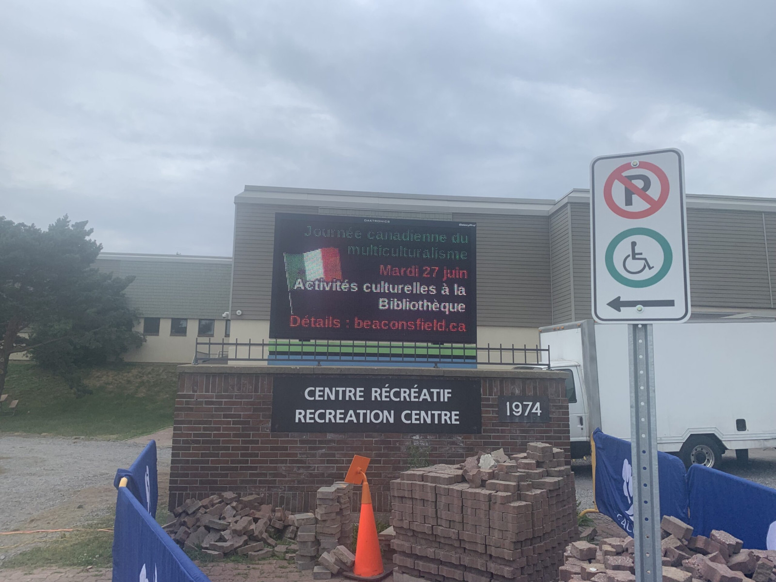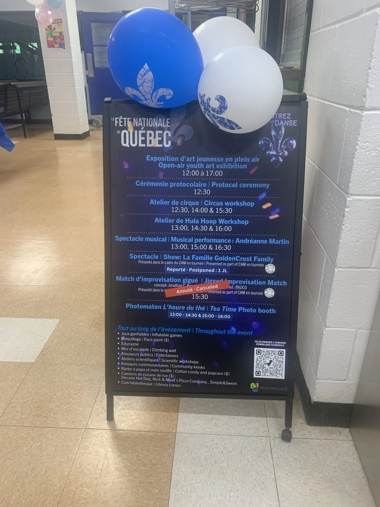 Necolas me dépose aux portes du Beaconsfield Rec Center. Les célébrations de la Saint-Jean-Baptiste étaient censées se dérouler en plein air, au Centennial Park, mais ont été transférées à l’intérieur en raison des conditions météorologiques incertaines.