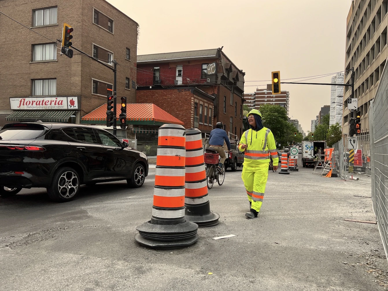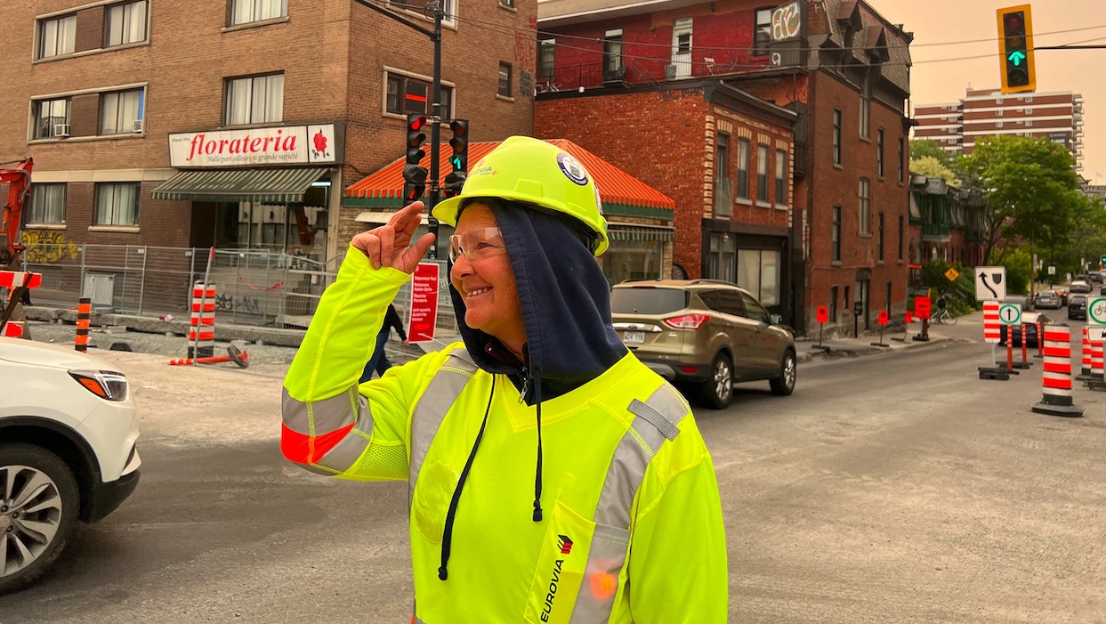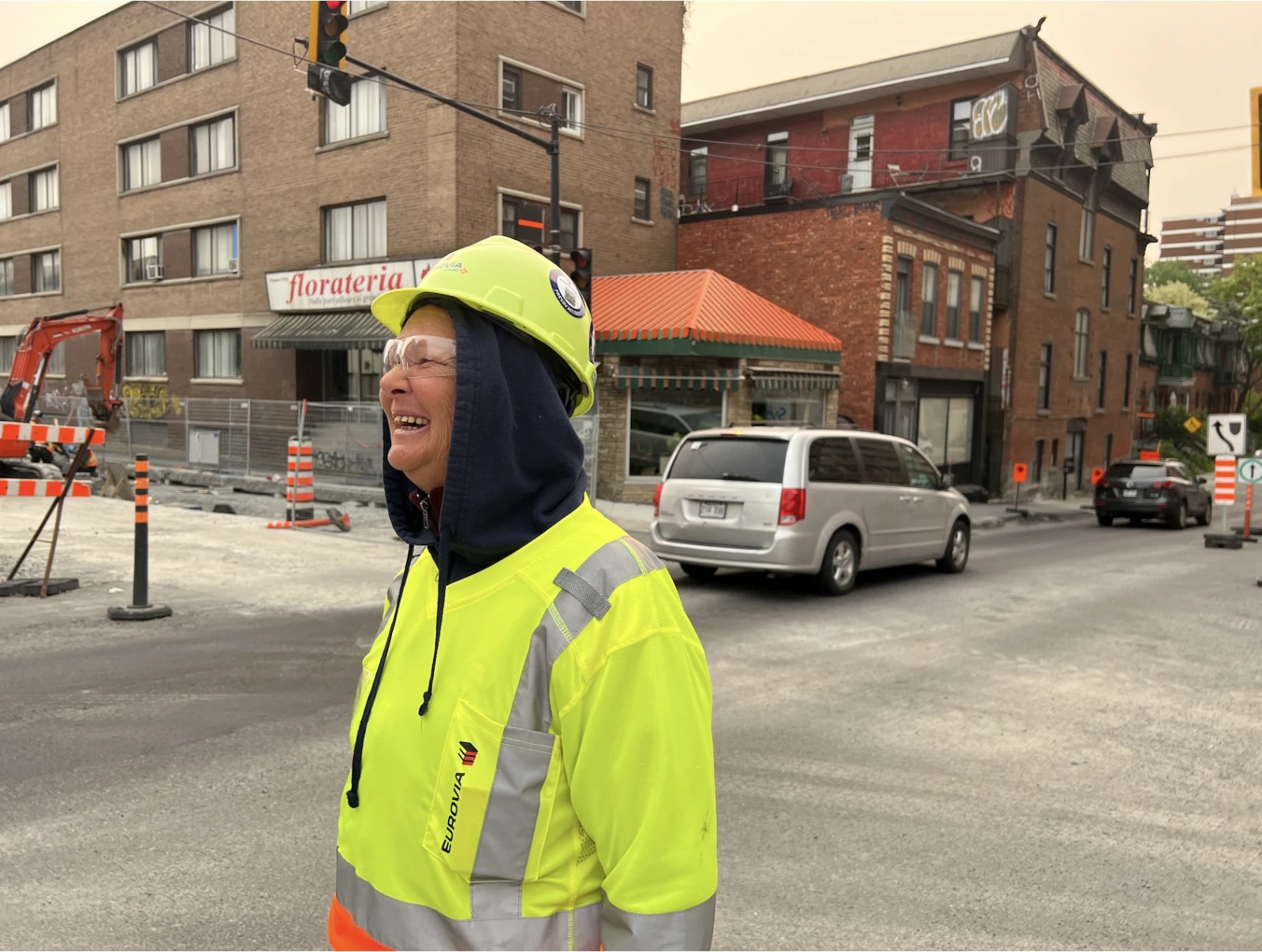 Au croisement des rues Pins et Saint-Urbain, un autre chantier de construction perturbe la circulation. Mais parmi la grisaille du matin et le vacarme du chantier, la femme toute de fluo vêtue se trouve en mission : répandre la bonne humeur, infuser de la patience et une touche d’amour aux matins des citoyens. Et ça marche.