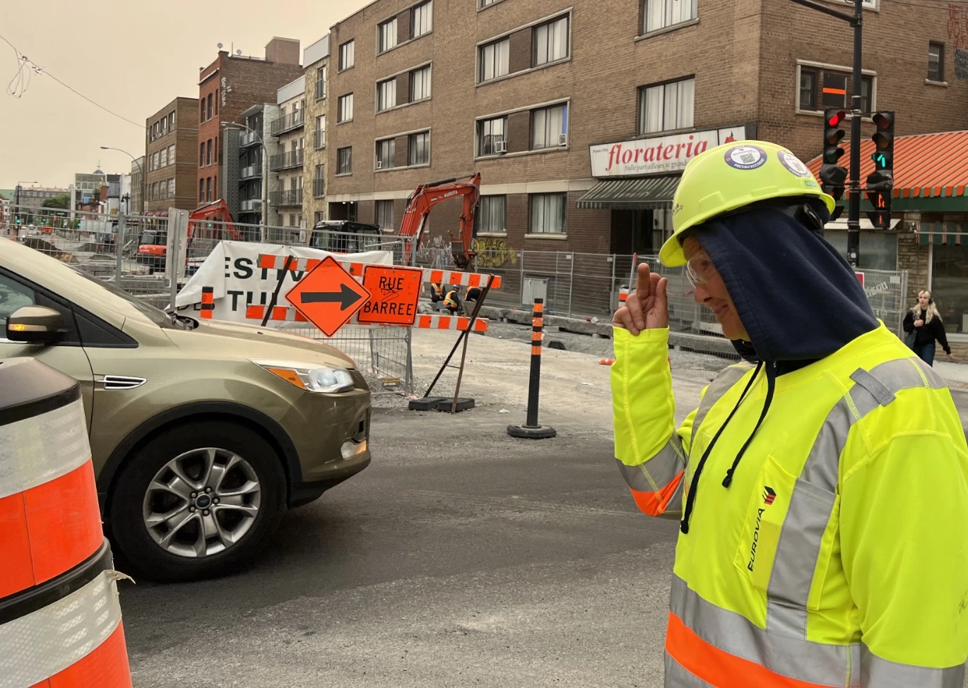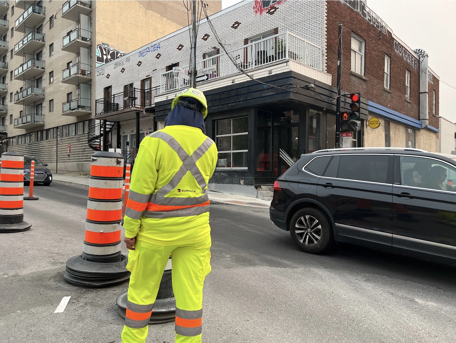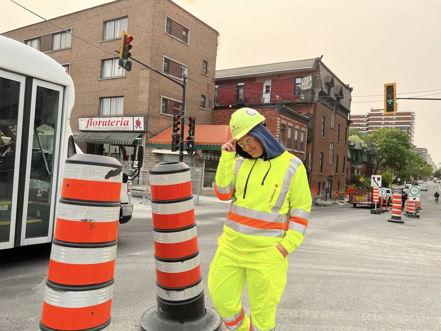 Au croisement des rues Pins et Saint-Urbain, un autre chantier de construction perturbe la circulation. Mais parmi la grisaille du matin et le vacarme du chantier, la femme toute de fluo vêtue se trouve en mission : répandre la bonne humeur, infuser de la patience et une touche d’amour aux matins des citoyens. Et ça marche.