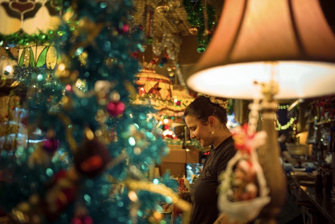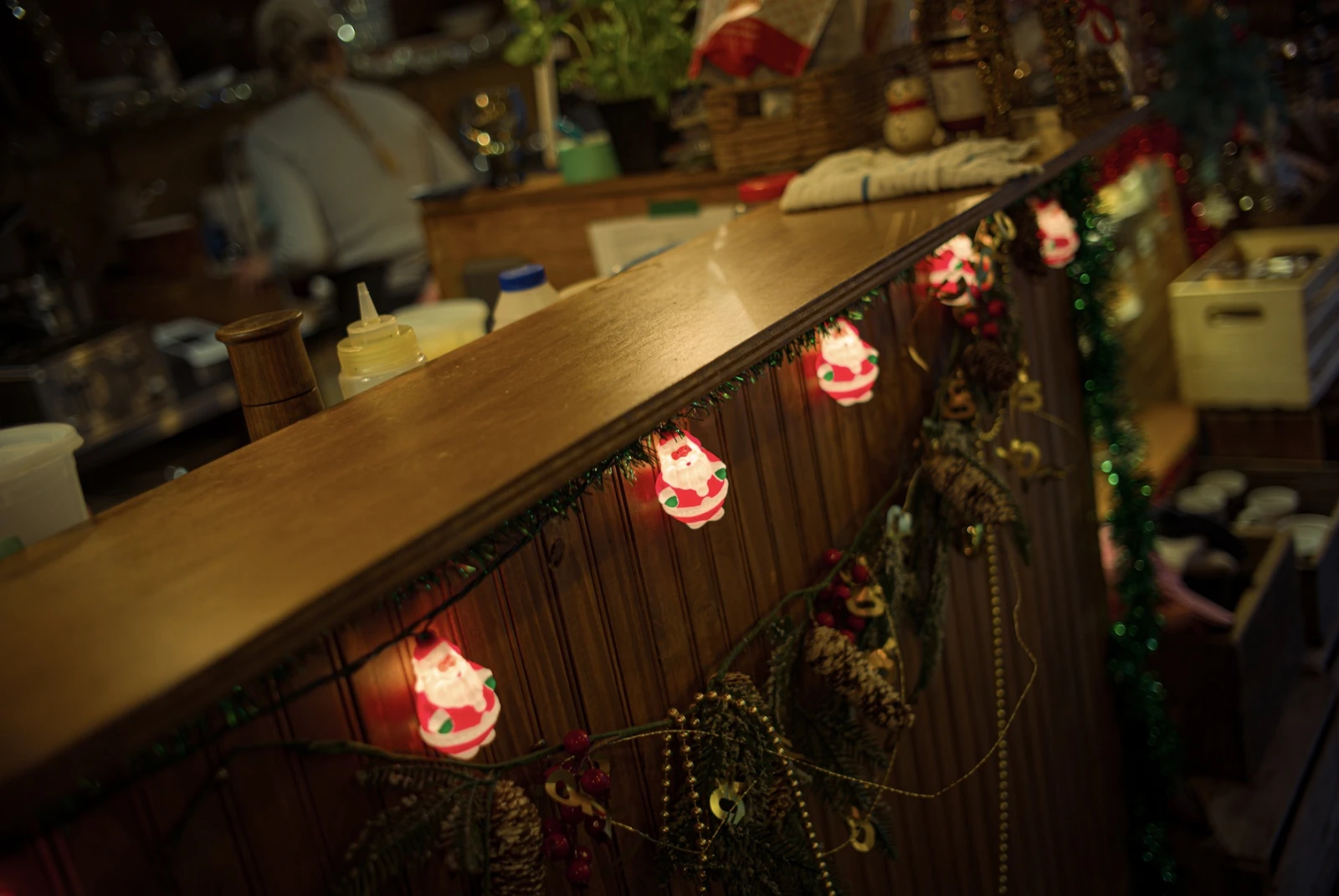 L’atmosphère à l’intérieur est aussi unique qu’inventive. Le décor, un joyeux mélange de maximalisme assumé et de kitsch revendiqué, capte instantanément le regard. Tout brille et éblouit : des casse-noisettes aux guirlandes lumineuses, en passant par des sapins chargés de tinfoil. À l’entrée, une armée de pères Noël en plastique monte la garde. En passant la porte, on plonge dans un Noël rétro, où chaque détail semble minutieusement conçu pour réveiller des souvenirs enfouis.