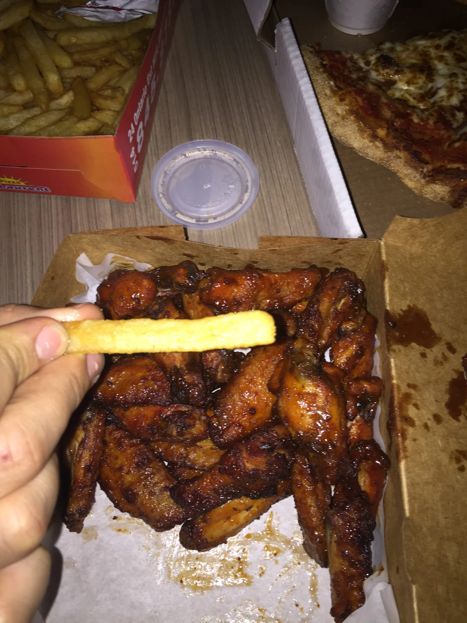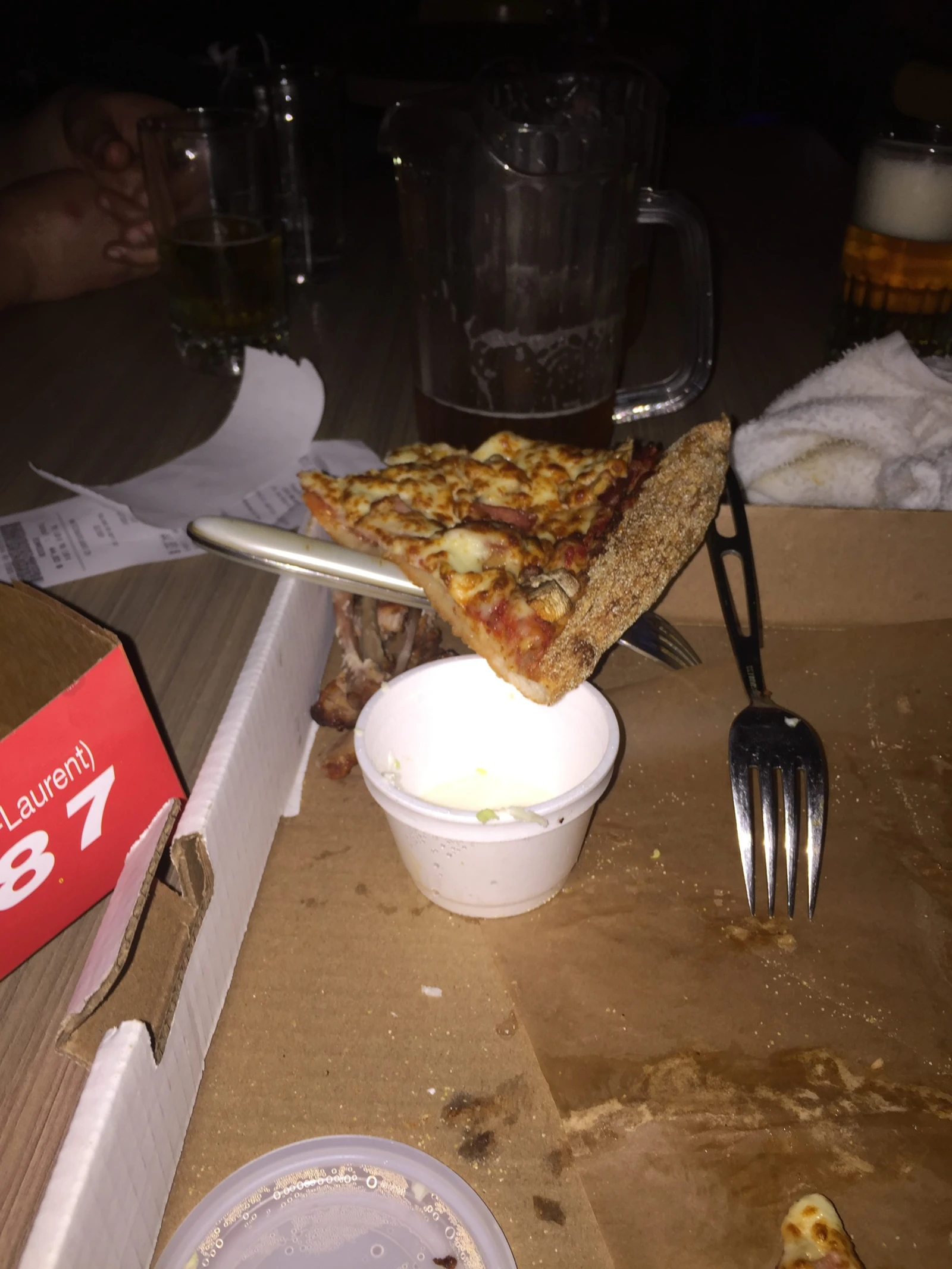 Après une analyse poussée des menus, autant au niveau graphique qu’alimentaire, nous nous rabattons sur le Pizza Saint-Laurent, chaleureusement recommandé par notre serveur courtois. Pour un peu plus de 40$, le deal réunissant 20 ailes de poulet, une pizza québécoise extra large et quatre litres de Pepsi (judicieusement remplacées par quatre ailes de poulet lors d’une ronde de négociations ardues au téléphone) est un nouveau classique des temps modernes.