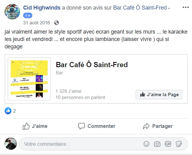 Décidés à trouver la plus authentique taverne qui soit, nous poursuivons cette évaluation approximative et forte en ironie des plus prodigieux débits de boisson avec le café bar Ô Saint-Fred alias «le seul et unique bar de style taverne au coeur du centre-ville de Drummondville depuis 20 ans !» selon ce qu’indique sa page Facebook.