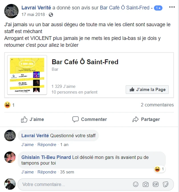 Quant à lui, ce témoignage bien amer du mystérieux pyromane Lavrai Vérité, qui n’a aucun ami depuis son arrivée sur Facebook en mars 2018, ressemble davantage à un règlement de comptes qu’à un vrai avis.