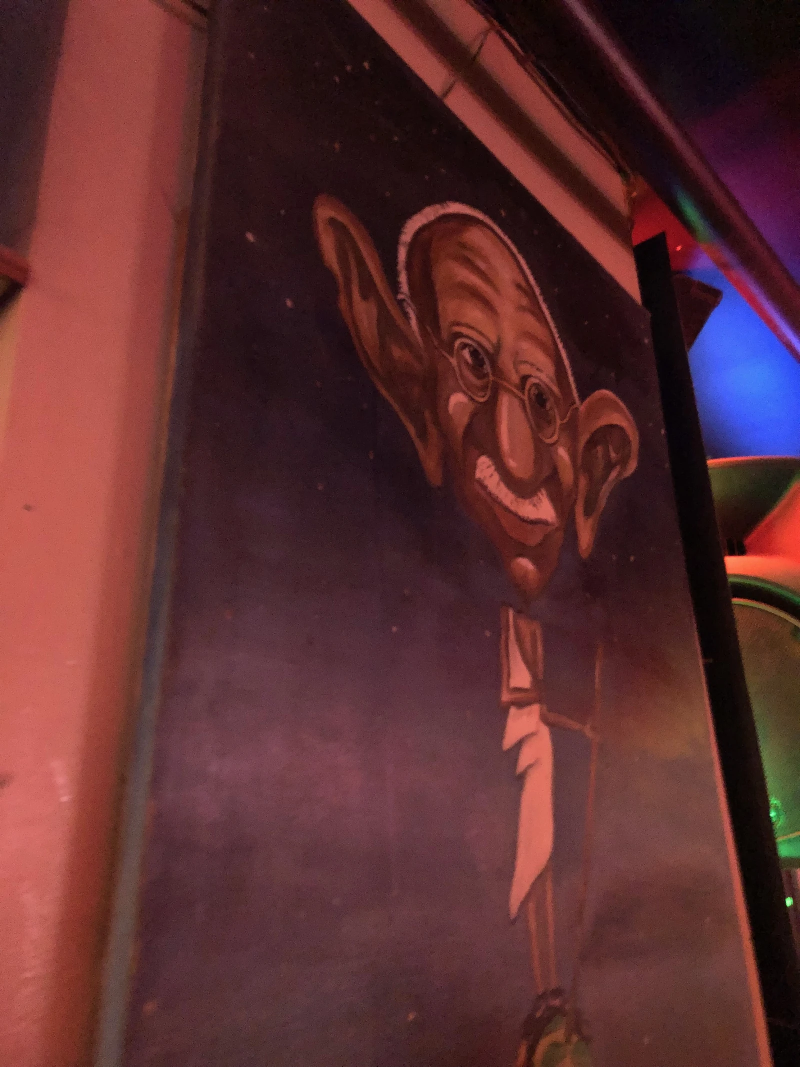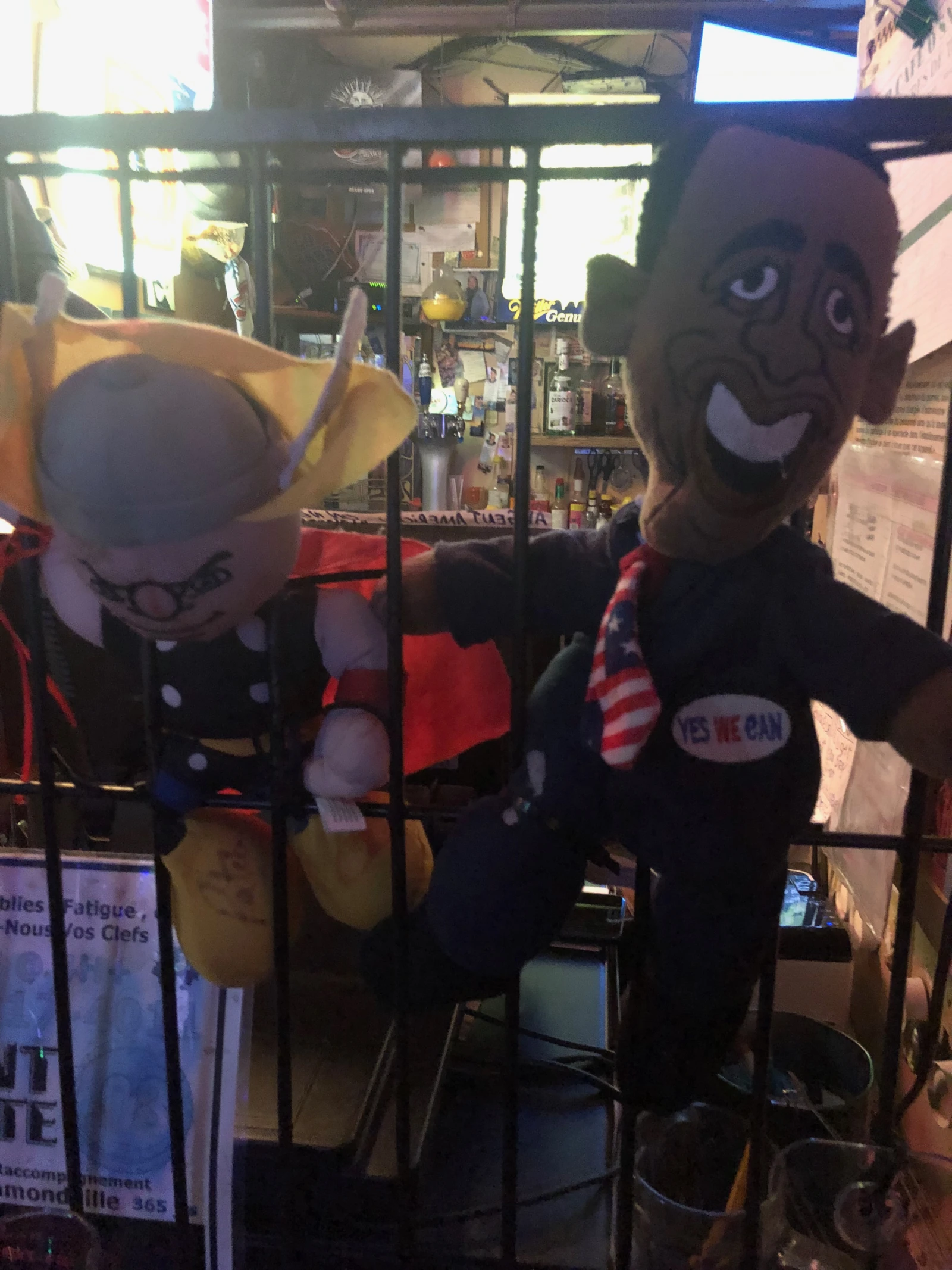 Signe supplémentaire qu’il ne fallait pas se laisser berner par l’accueil spectaculairement raciste que nous avons reçu, le bar Ô Saint-Fred déjoue nos attentes et nous témoigne d’un penchant pour les icônes internationales évoquant la diversité, la paix et, dans une perspective peut-être moins notoire, la sexualité déviante avec de jeunes femmes.