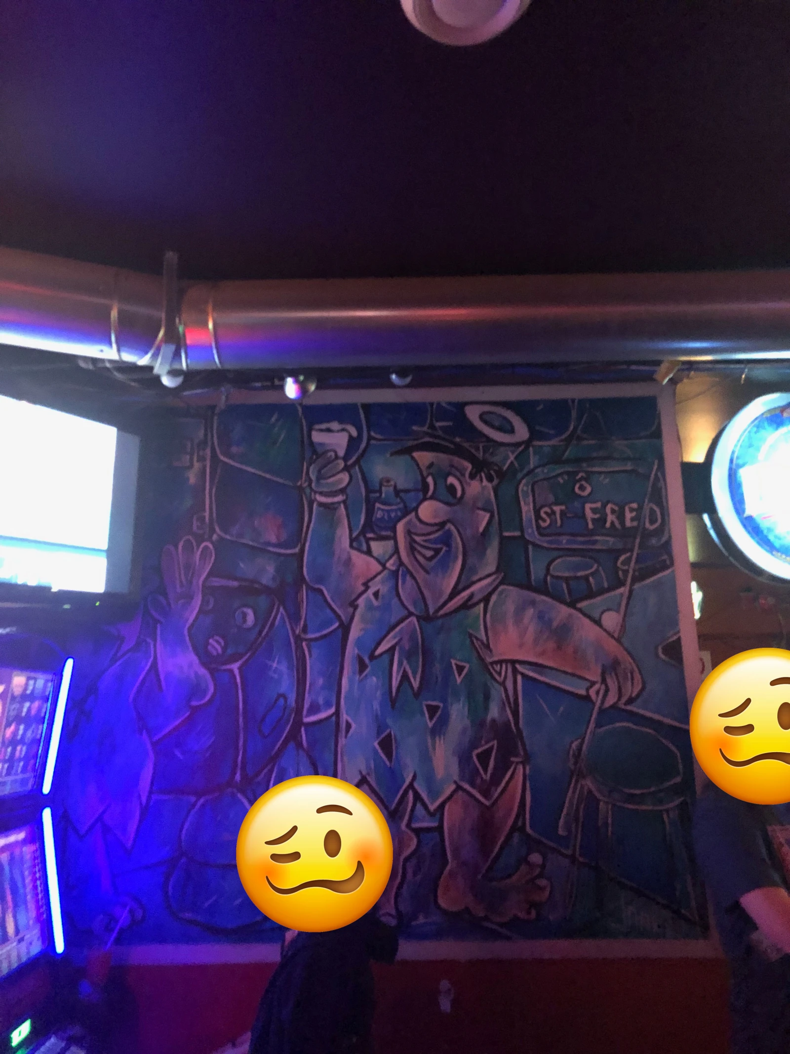 Autre murale digne de mention : celle de Fred Caillou, qui nous fait finalement remarquer que le Fred canonisé qui a donné son nom au bar, c’est lui.