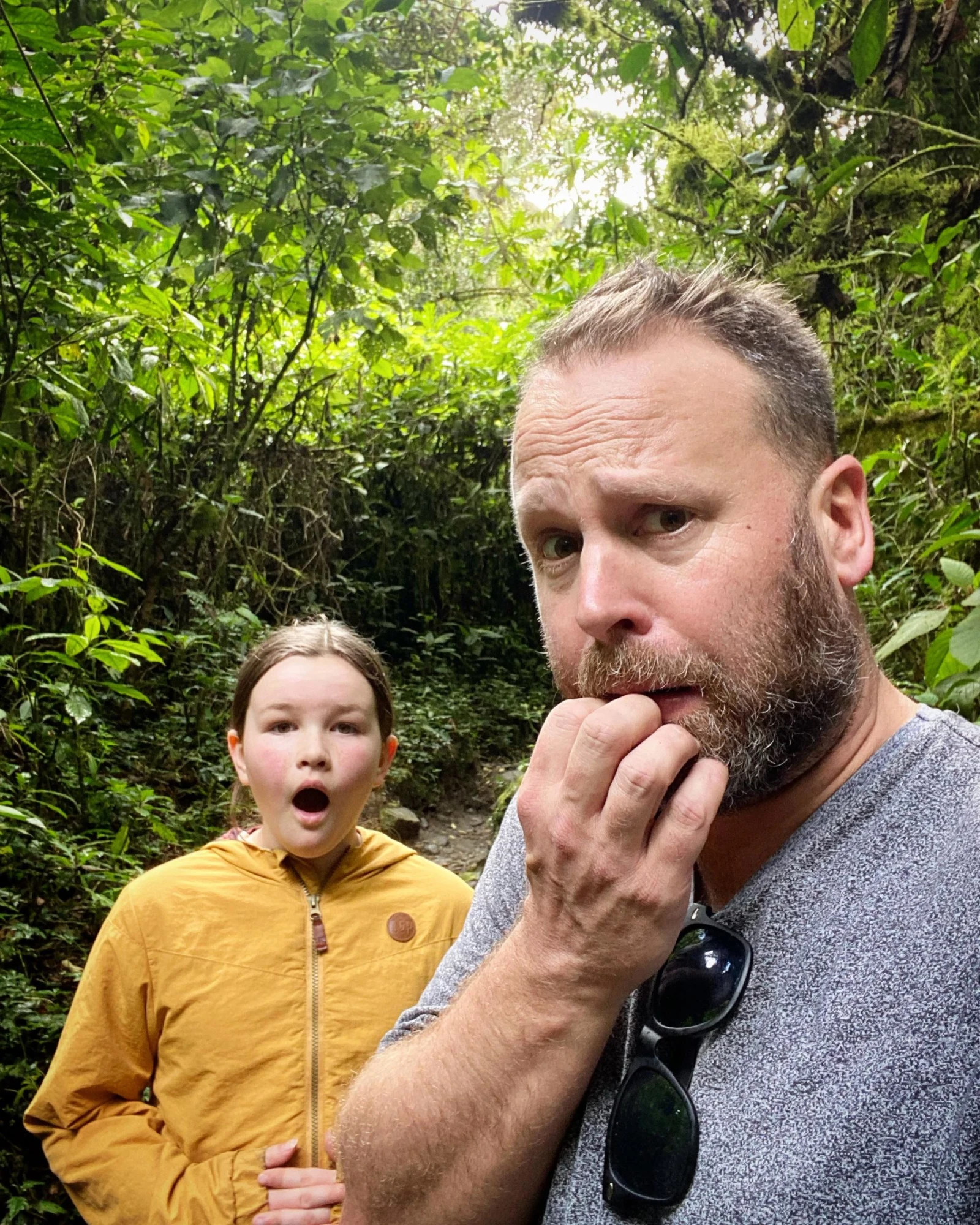 Pour une raison à ce jour inconnue (je jasais avec une touriste française qui m’a vite semé la maudine), je me suis ramassé seul avec Simone pour la quasi-totalité du retour (2h en pleine forêt), où je devais montrer l’exemple et masquer ce sentiment de terreur qui grimpait en moi à mesure que j’avais l’impression de me perdre. Je paranoïais les titres: « un touriste canadien et sa fille se perdent dans la jungle et se font dévorer par des boas constrictors : leurs souliers Salomon neufs retrouvés sains et saufs. »