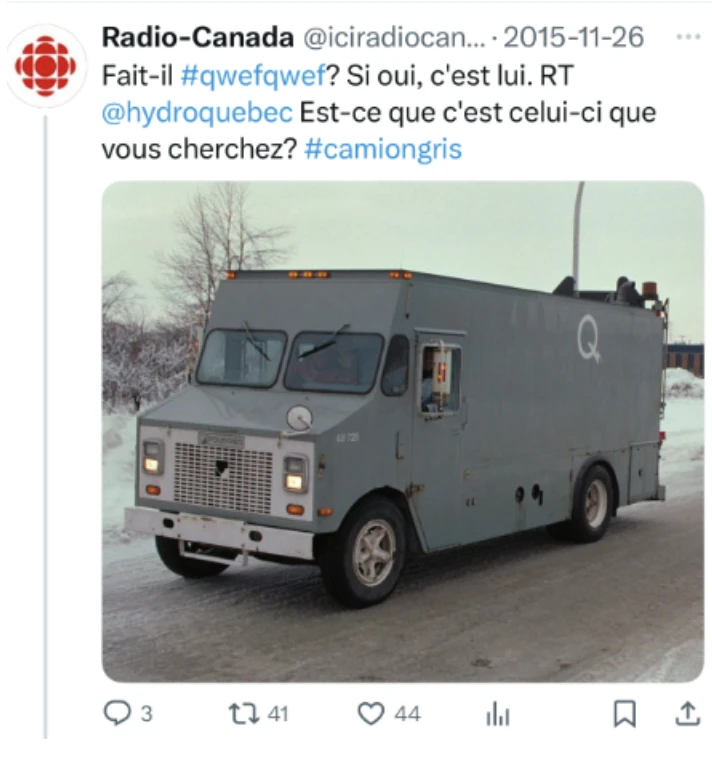 Il n’en fallait pas plus pour enflammer les réseaux sociaux de l’époque qui se sont emparés de l’affaire dans un esprit bon enfant. Selon le Journal de Montréal : « À peine quelques minutes plus tard, le mot-clic #CamionGris commençait déjà à circuler, atteignant même la deuxième place des tendances sur Twitter au Canada et la première à Montréal ». Des quidams, des artisans et même Hydro-Québec se mettent alors de la partie. La SRC emboîtera le pas de bonne grâce, choisissant d’en rire plutôt que d’en pleurer.