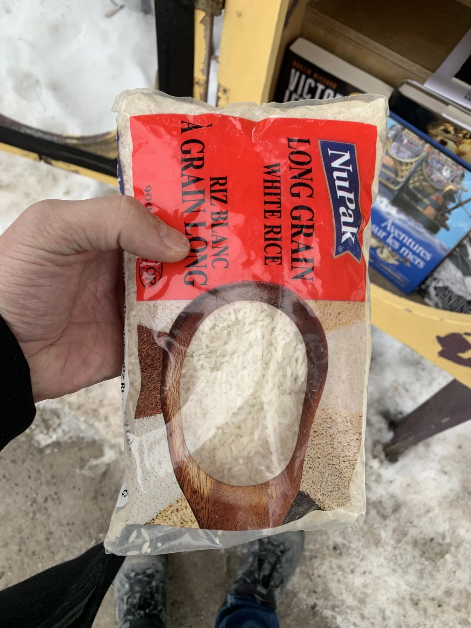 Un sac de riz. Encore une fois, je comprends l’intention, mais il existe des organismes pour ça. C’est contre-productif de jouer à la cachette avec ses propres élans de générosité. La poche a été prise, d’ailleurs, mais j’ignore si c’était par quelqu’un qui en avait besoin ou simplement par quelqu’un qui trouvait ça cool de tomber sur un sac de riz gratis.