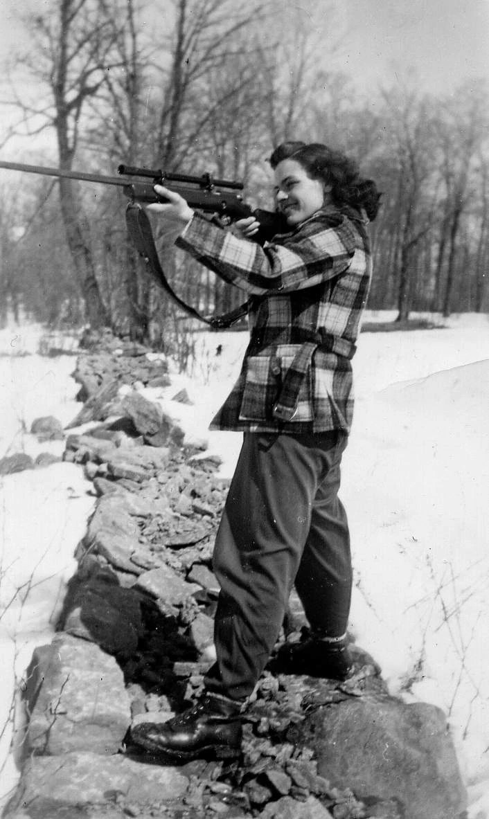 Quand elle était jeunette, son père lui a donné une carabine. Chaque année, il lui donnait un baril de balles pour aller avec. Elle pratiquait sur un mur dans la cave. Ça rendait son petit frère jaloux. Ma grand-mère tirait avec précision.