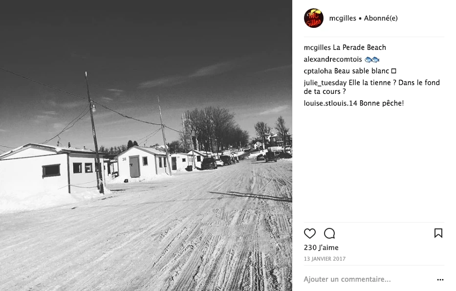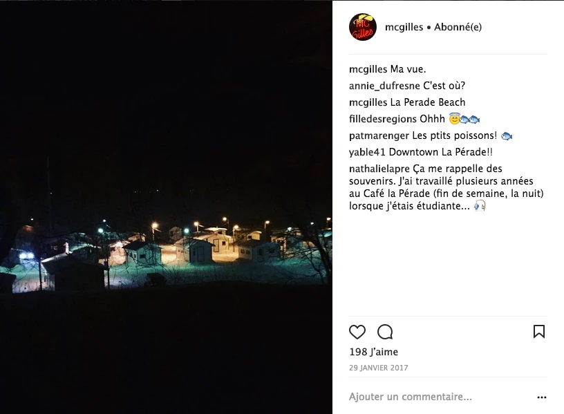 Le plus beau temps de l’année, c’est le poisson des chenaux. Visuellement, c’est impressionnant de voir un village se construire direct sur de la glace. Il y les cabanes, les chemins entre les cabanes, les gens qui pêchent et qui patinent sous les néons. C’est très cinématographique! Je trouve ça beau! C’est vraiment ma cabane au Canada. On a de la misère avec l’hiver, mais habille-toi pis va déhors!