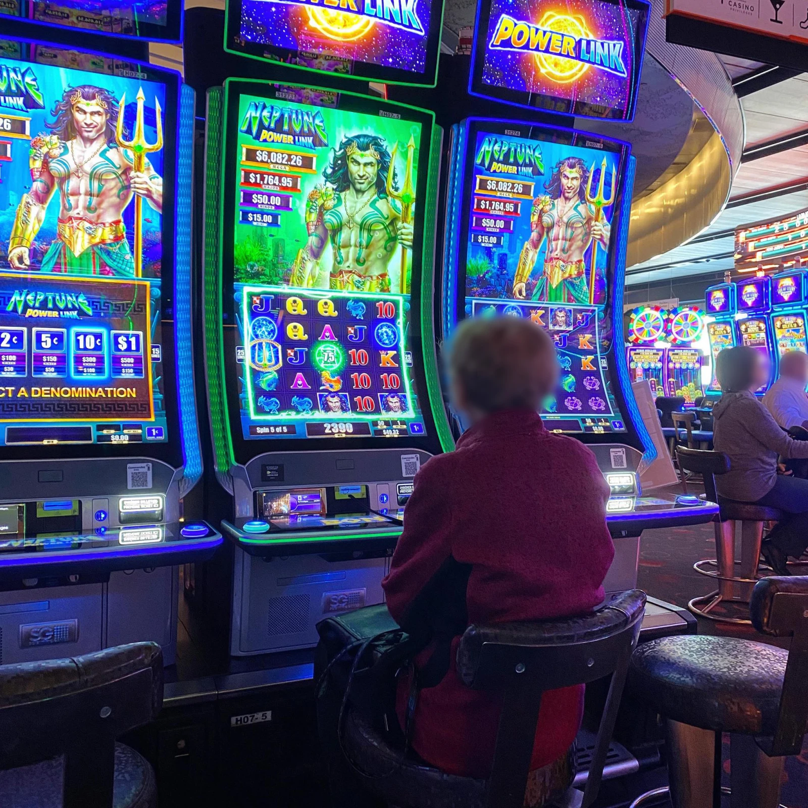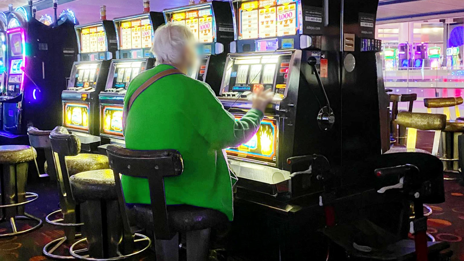 Un contraste assez drastique avec cette dame esseulée à l’arrière qui joue simultanément sur deux machines, le visage dénué d’expression.