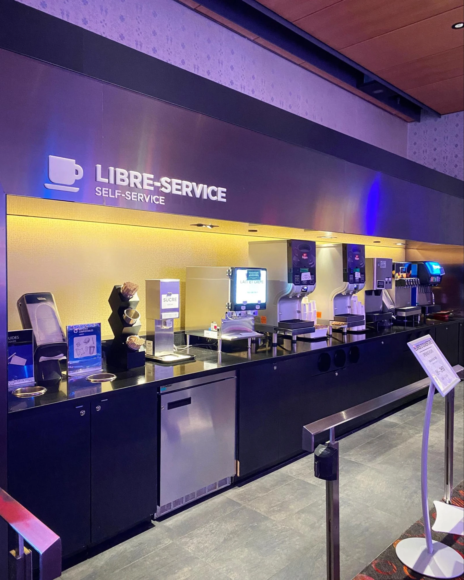 De retour sur le plancher du casino, des bornes de recharge de cellulaires et des comptoirs libre-service sont situés sur chaque étage et permettent aux visiteurs de boire de la liqueur et du café gratos..