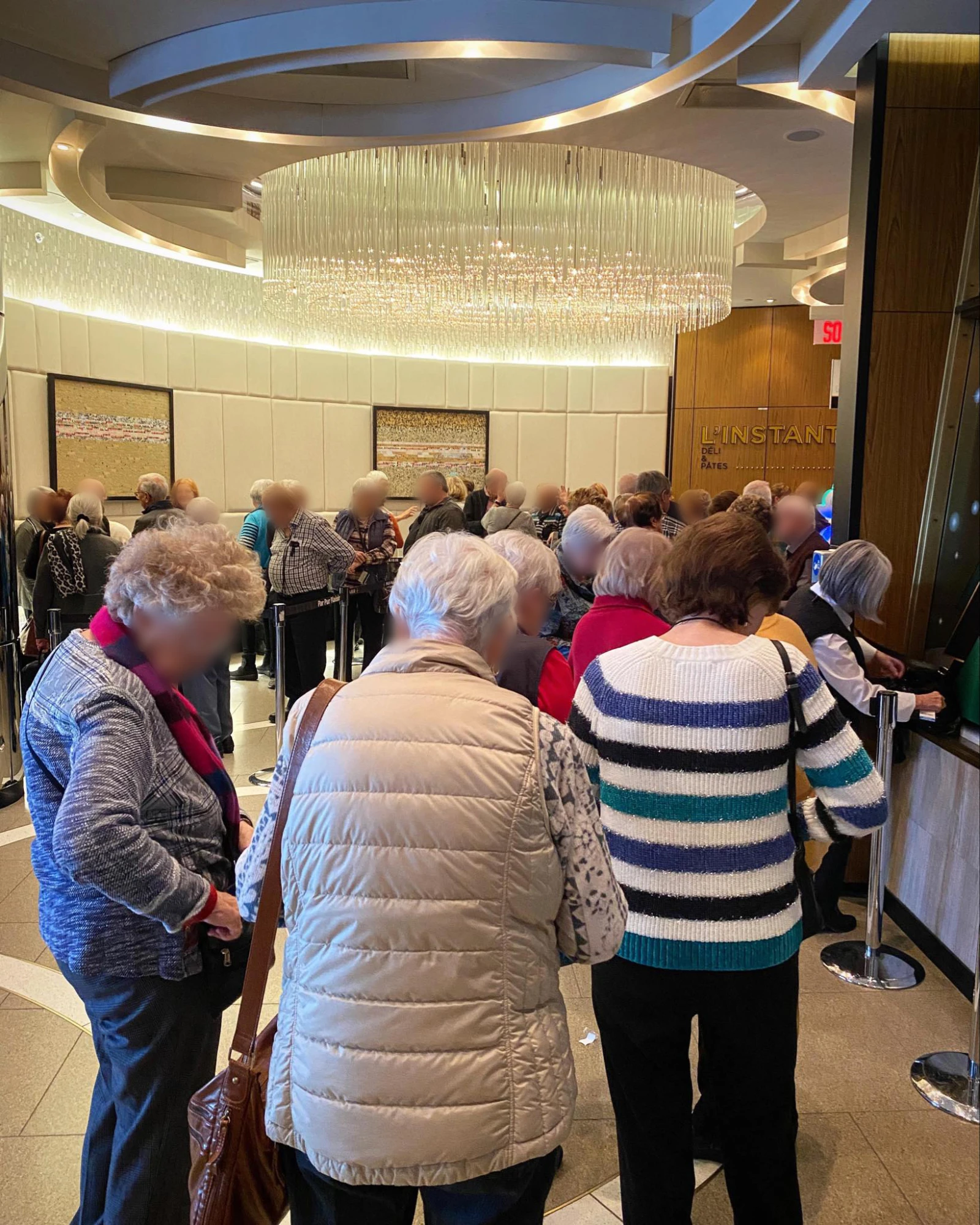 Pour célébrer, direction le restaurant du cinquième. Un bouchon monstre de têtes blanches en file devant l’entrée freine toutefois mon élan. Le resto est bondé.