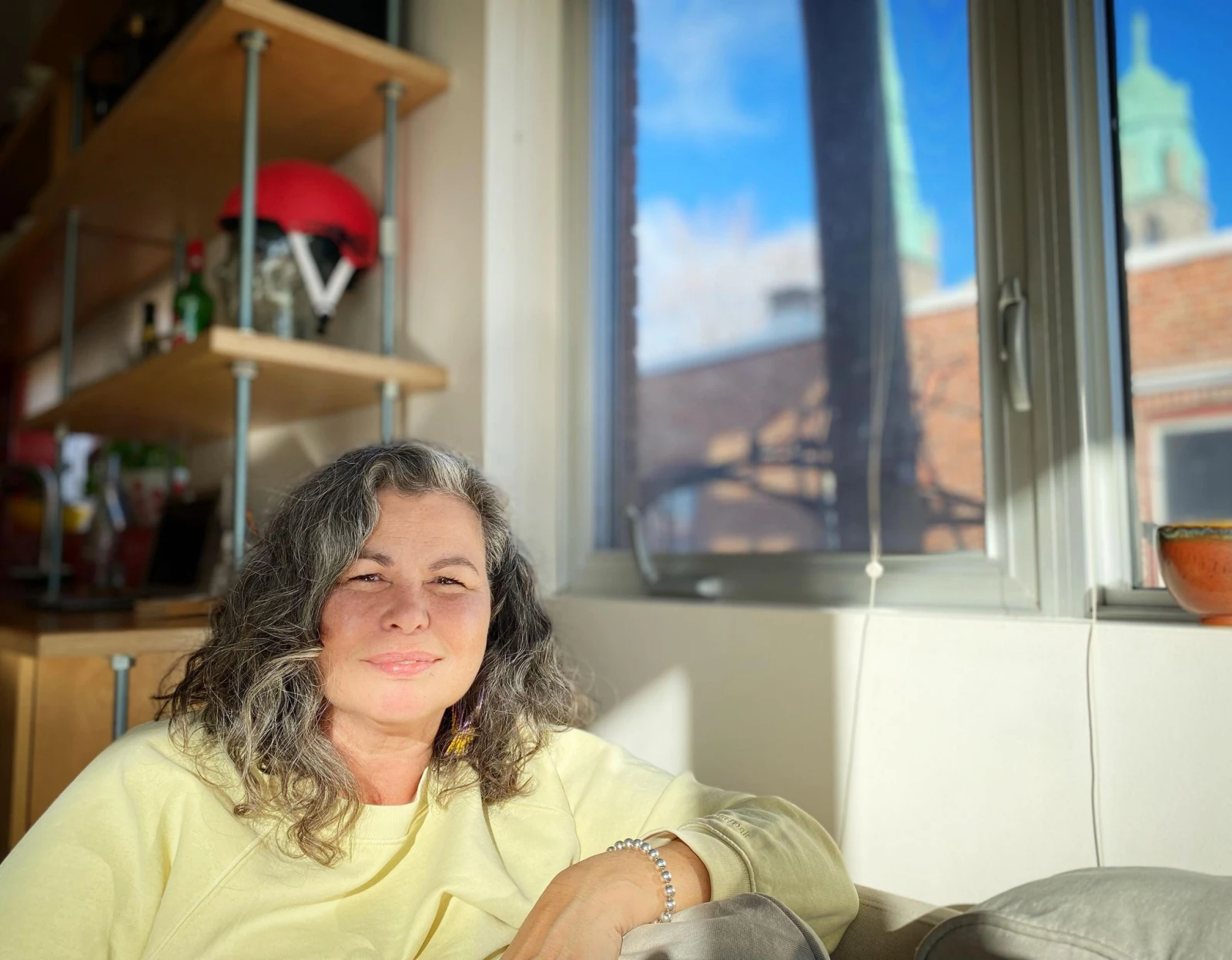 Par la fenêtre, on aperçoit l’église voisine, dont les cloches résonneront par deux fois durant notre entretien. « Pour moi qui est apostasiée, ça me rush », avouera-t-elle avec ses yeux pétillants. Il fait soleil dehors, la lumière reflète joliment sur son visage.