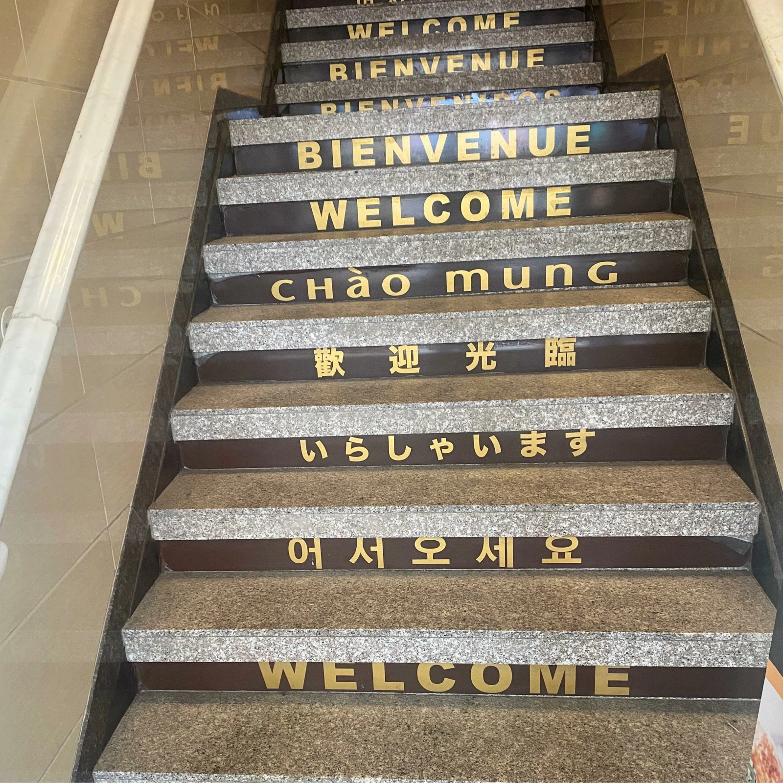 L’après-midi tire à sa fin. Émile a quitté son spot, qu’il a laissé propre. La porte pour accéder au restaurant La Toxica et au gaming café est toujours verrouillée. À travers la porte vitrée, on peut lire plusieurs traductions du mot « bienvenue » peintes sur les escaliers.