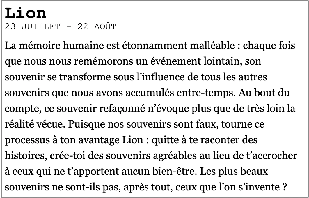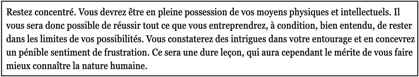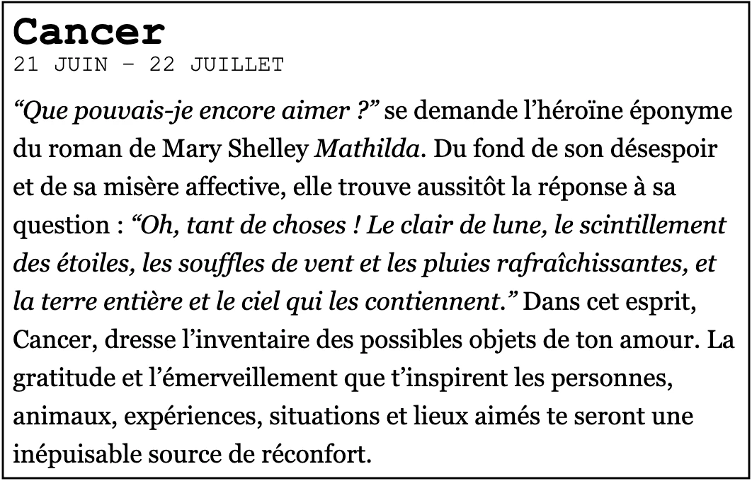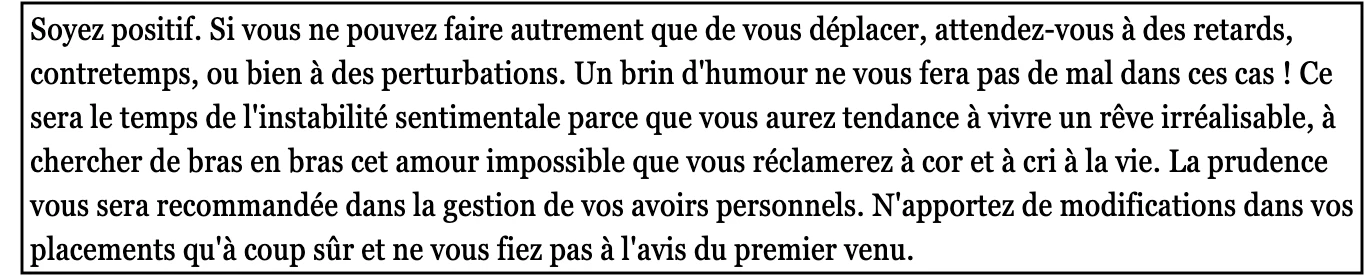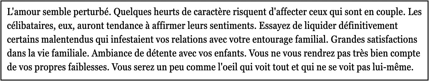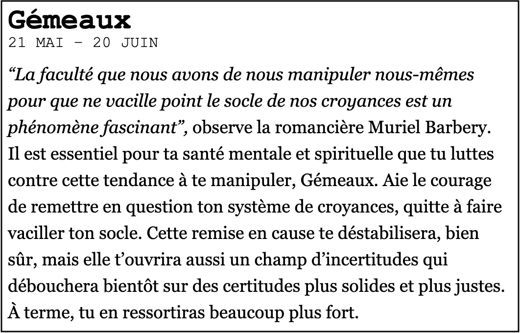 Ont été analysés, dans l’ordre, les horoscopes du Elle France, du Madame Figaro et du Courrier international.