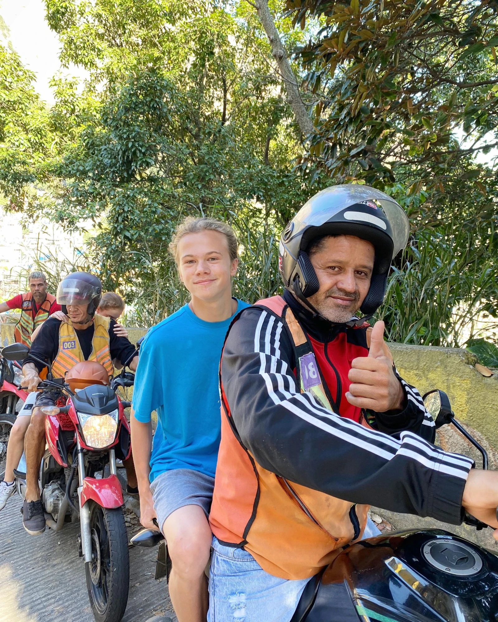 Il nous conduit ensuite vers un stand de moto taxi où quatre chauffeurs nous grimpent au sommet pour contempler la favela d’en haut. Gros must de se cramponner à l’arrière à travers les rues serpentines. L’ascension est très abrupte, faut se tenir. Marie-Claude riait tout le long et les ados avaient un sourire estampé au visage à destination.