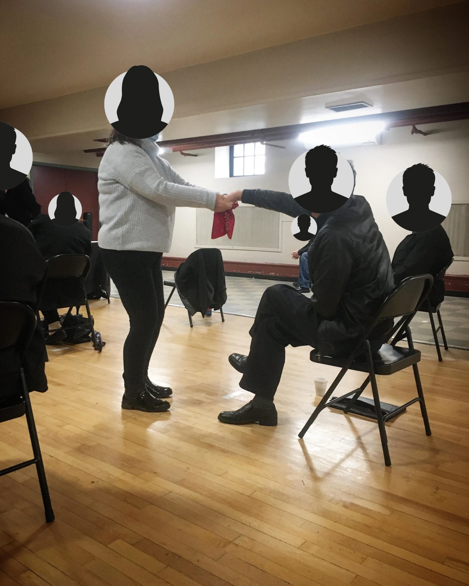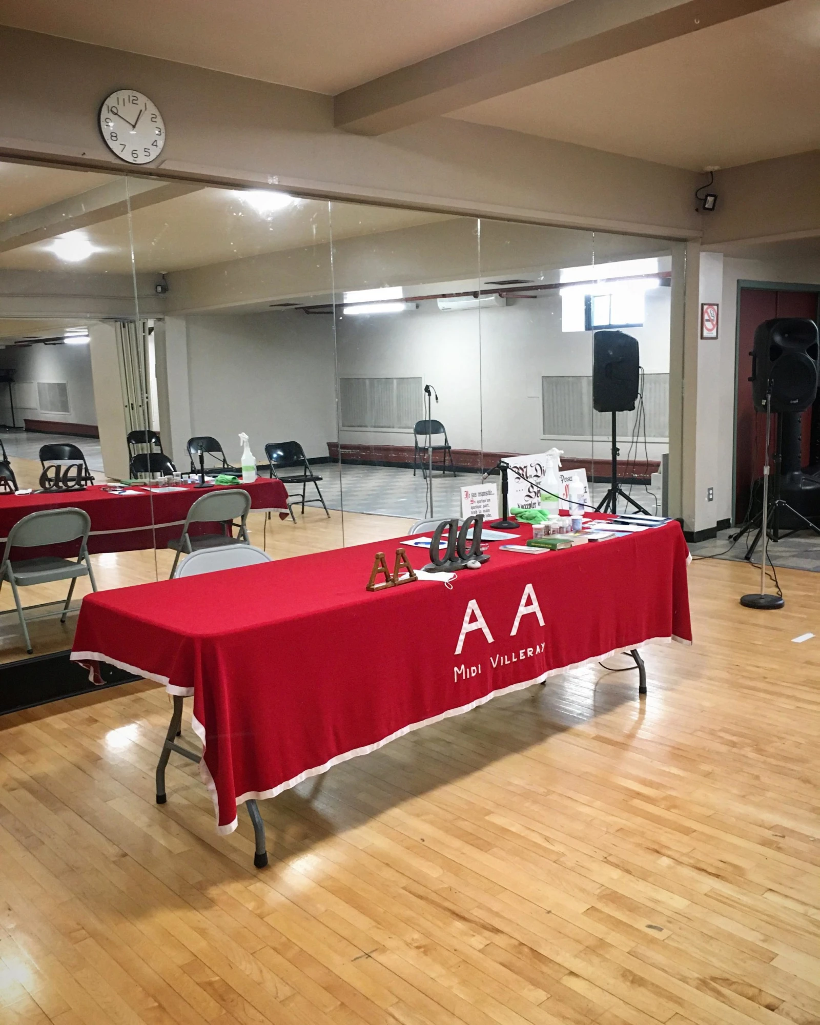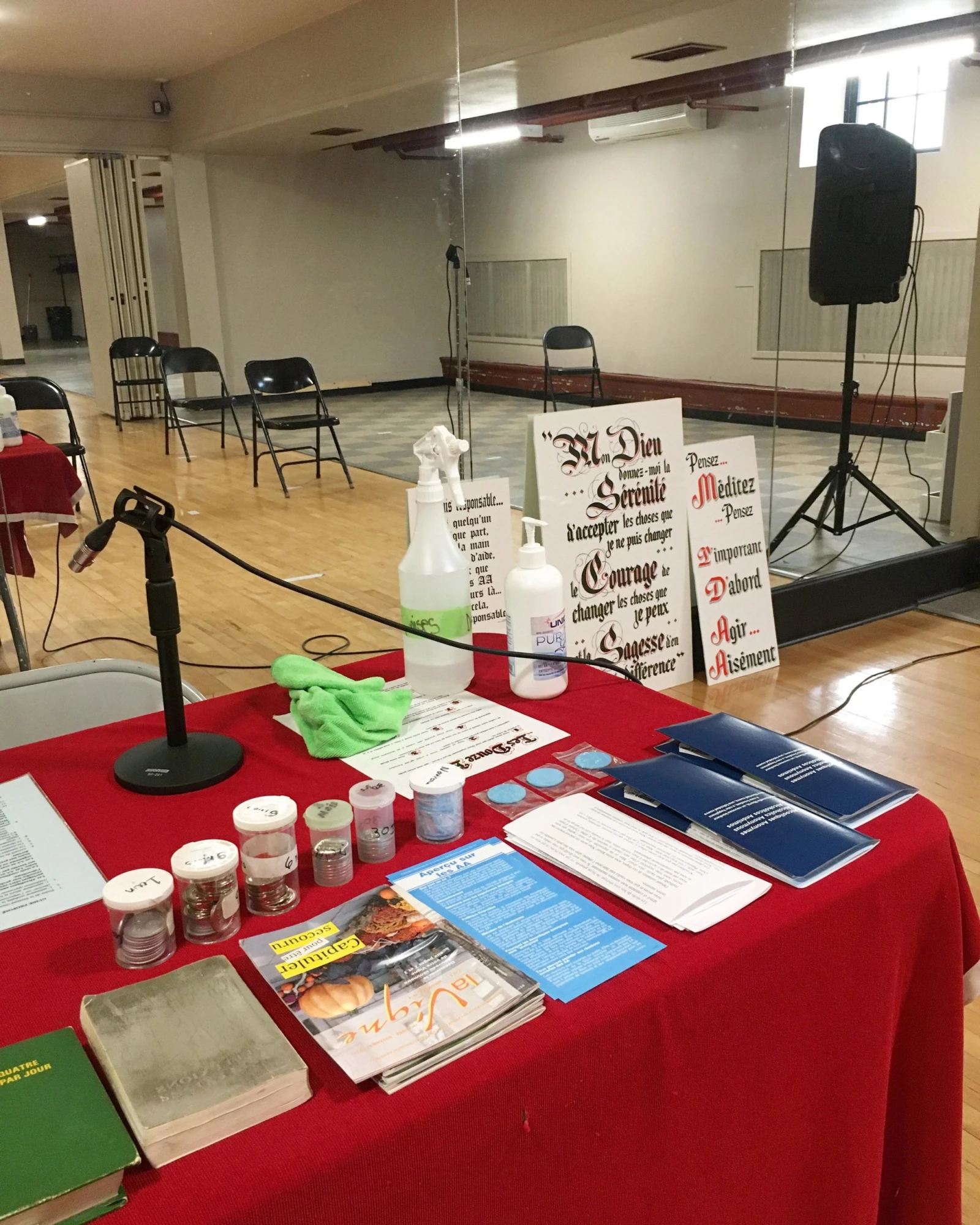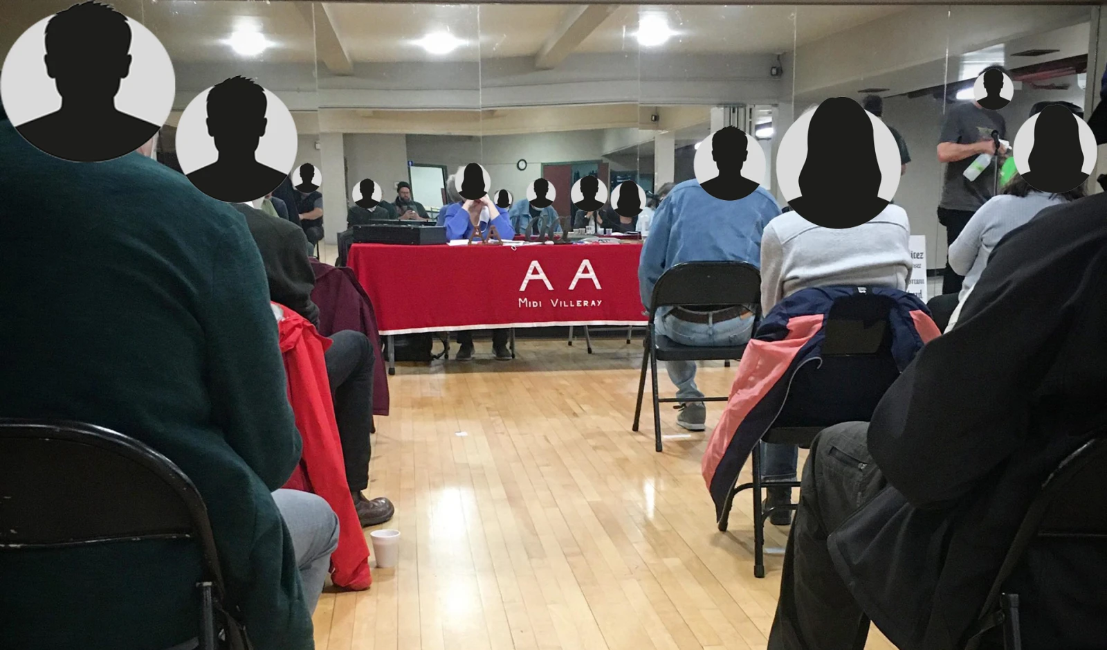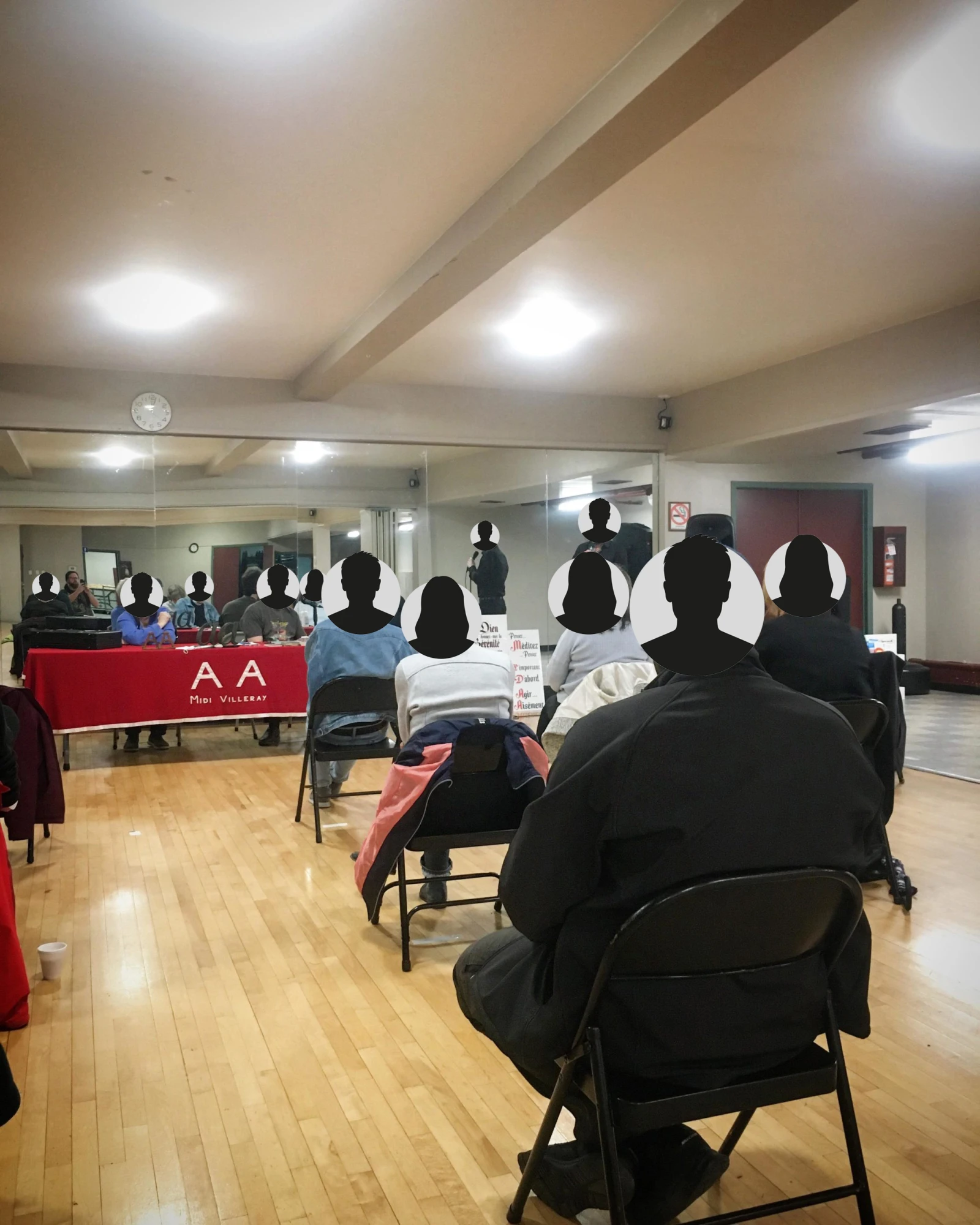 Il y a deux personnes derrière une table à l’avant, installée devant un grand miroir qui recouvre l’entièreté du mur. André, sobre depuis 32 ans, se présente au micro pour le traditionnel accueil des nouveaux.