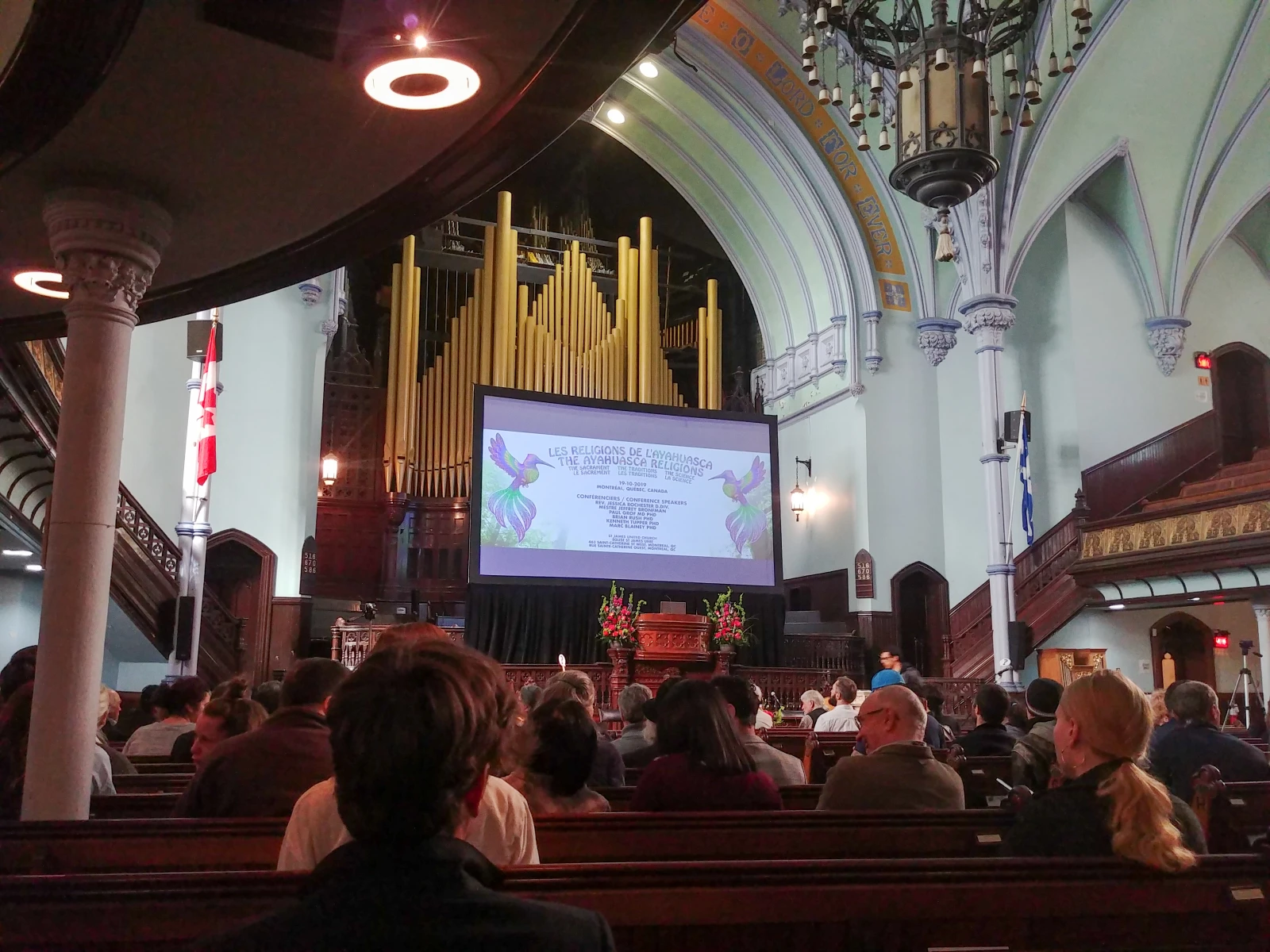 Dans l’église, l’ambiance rappelle une peu celle d’une procession religieuse. Une dizaine de personnes portant le même chandail (conçus pour l’occasion) sont postées dans les coins. On ressent une bienveillance… rigide. Il faut dire que le discours de ceux et celles consommant des substances psychédéliques à des fins spirituelles a souvent été déformé par le passé.