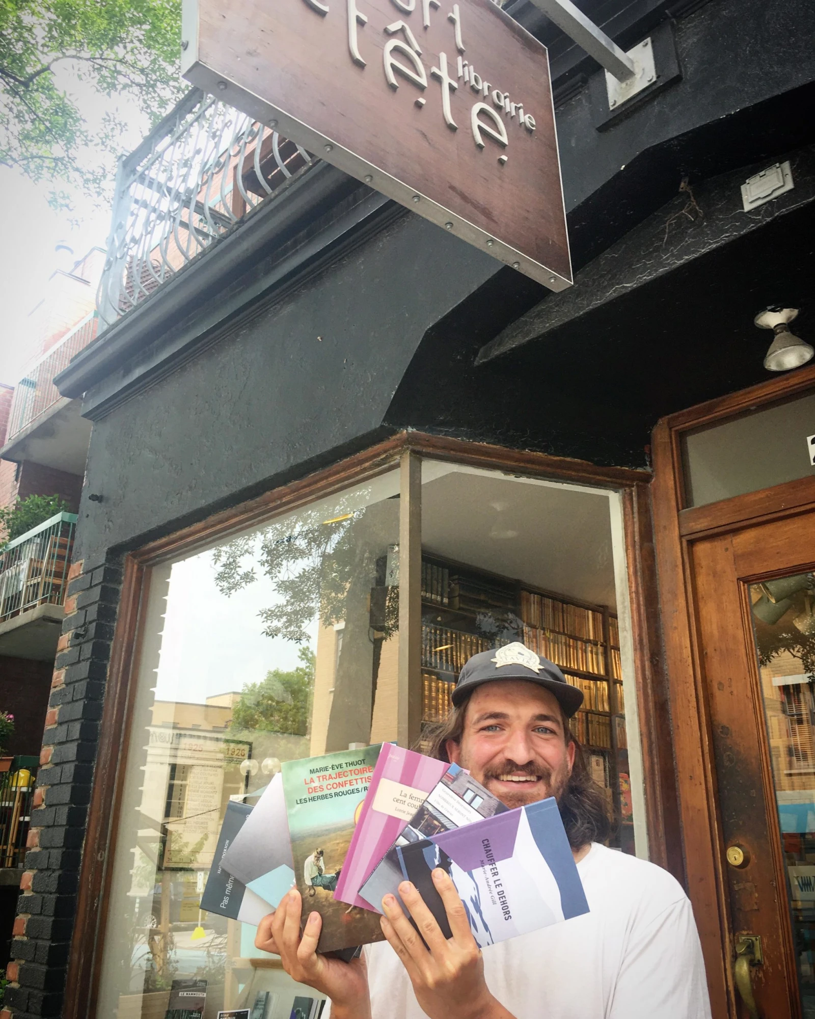 Tout près dans les rayons, Arnaud Lapierre faisait le plein de livres québécois à la veille de prendre la route pour retourner chez lui en Gaspésie, où 99% de la population a pris ses vacances cet été. « J’ai grandi ici et je venais souvent à cette librairie », explique l’enseignant en littérature au Cégep de Gaspé, venu acheter cinq livres québécois, dont deux recueils de poésie. « Tous mes livres ont été écrits par des femmes et je ne m’en étais même pas rendu compte ! », réalise Arnaud en abordant le sujet de l’achat éthique qui semble avoir la cote cette année, même de manière inconsciente.
