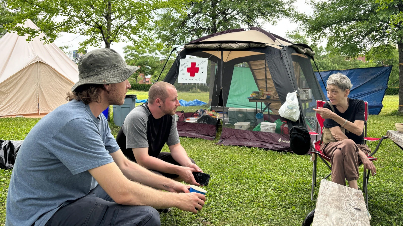 Un camion d’entretien de la Ville passe à côté de nous dans le sentier traversant le parc. Son conducteur envoie la main à Léandre et Guillaume. « On est en train de s’organiser et jusqu’ici, nos relations sont bonnes avec la Ville, mais aussi avec les citoyens », souligne Guillaume, spécifiant que l’emplacement de leur campement n’a pas été choisi au hasard. Sur place, il y a des boîtes pour récupérer les seringues, deux toilettes chimiques, des dépanneurs ouverts 24h et les appartements voisins sont considérablement reculés.